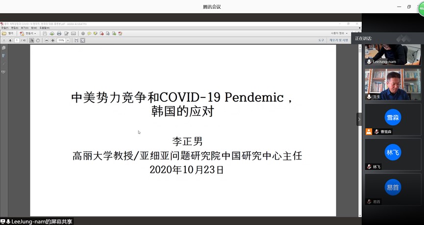 20201023日下午14时,由成人抖音 主办的名家讲座,在腾讯会议室举行。本次讲座邀请了高丽大学亚细亚问题研究院中国研究中心主任李正男教授担任主讲嘉宾,作题为“中美势力竞争和新冠肺炎疫情—韩国的应对”的学术讲座。成人抖音 国际政治系博士生导师王生教授担任讲座主持人,参加者包括成人抖音 部分老师、研究生、本科生以及国内其他高校师生共八十余人。
