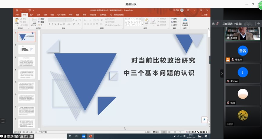 20201130日下午14时,由成人抖音 主办的教师科研水平助力计划第十七期活动,在腾讯会议室举行。本次讲座邀请上海师范大学法政成人抖音 博士生导师、上海师范大学比较政治研究中心主任、CSSCI来源集刊《比较政治学研究》主编李路曲教授担任主讲嘉宾,作题为“关于比较政治学几个基本问题的认识”的学术讲座。成人抖音 廉政研究与教育中心副主任、成人抖音 政治学系副主任马雪松教授担任主持人,参加者包括成人抖音 部分教师、博士生、研究生及国内其他高校师生共六十余人。
