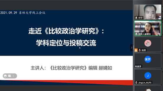 师生的愉快合作经历,并简要介绍了《比较政治学研究》集刊概况。刊物以世界百年未有之大变局为背景,为国家治理体系与治理能力现代化服务,面向政治学基础理论研究设有多个栏目。赫婧如老师对《比较政治学研究》的收稿流程进行了重点讲解。她从公开收稿、编辑初审、专家匿名外审、返回作者修改、主编终审、提交商务印书馆发表六个环节详细介绍了稿件刊发的基本流程,增进师生对于《比较政治学研究》学术期刊全流程、多方位的了解。赫婧如老师基于多年的稿件初审经验介绍了审核及采用稿件的主要标准,即审核稿件是否在收稿范围、研究是否重要、研究是否有新意、研究是否真实。赫婧如老师还从稿件处理流程出发总结了一些学术论文写作与投稿的注意事项。