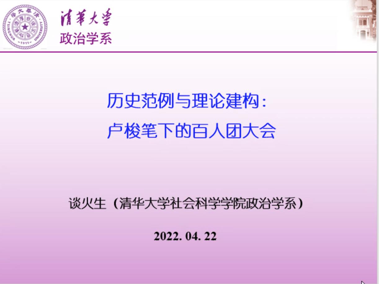 2022422日晚间,成人抖音 第59期中国政治研究工作坊在腾讯会议平台举行。清华大学政治学系副主任谈火生长聘副教授受邀担任主讲嘉宾,作题为“历史范例与理论建构——卢梭笔下的百人团大会”的讲演。本期工作坊由刘雪华副院长主持,云南大学政府管理成人抖音 匡自明教授、东北师范大学政法成人抖音 肖克教授、华中师范大学农村研究院任路副教授、成人抖音 马雪松教授、龚蔚红副教授、杨健潇副教授、朱万润副教授及部分国内高校政治学专业研究生、本科生60余人参与工作坊。