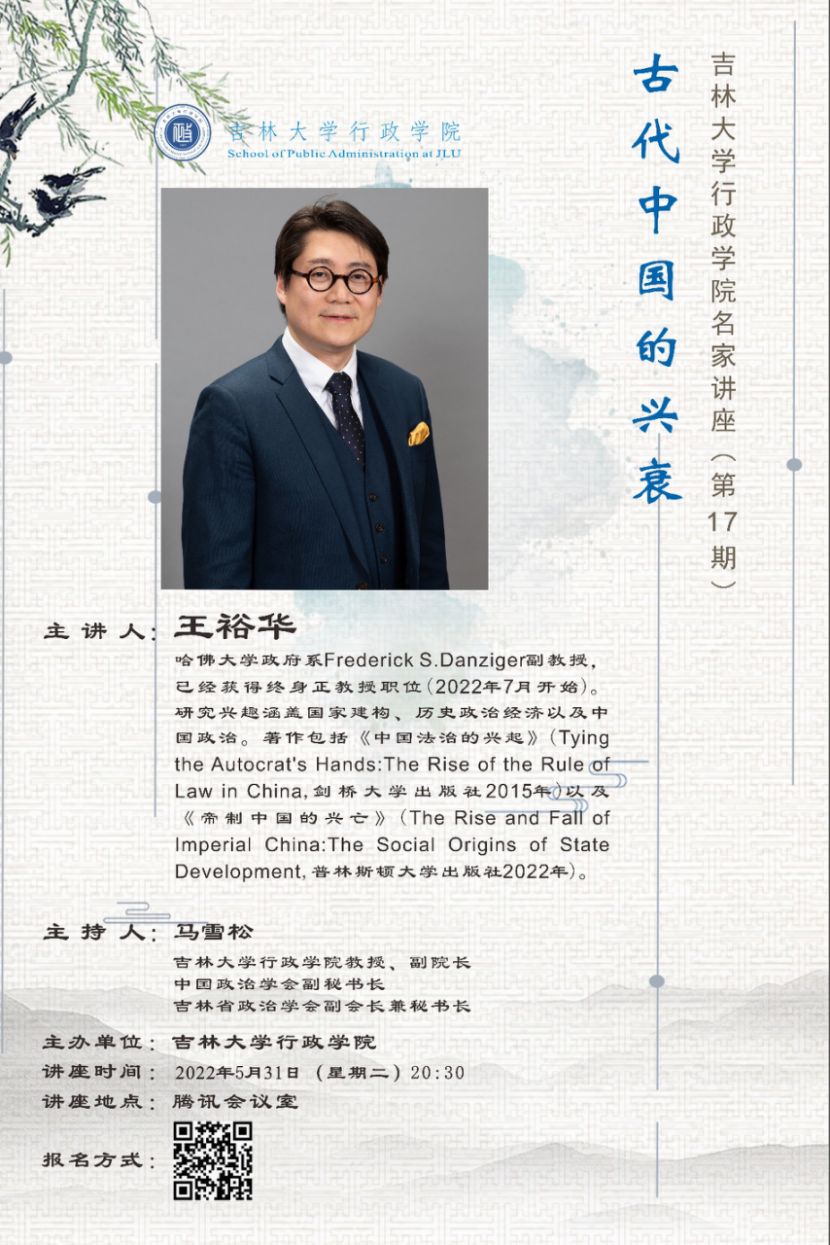 主讲人简介:哈佛大学政府系Frederick S.Danziger副教授,已经获得终身正教授职位(2022年7月开始)。研究兴趣涵盖国家建构、历史政治经济以及中国政治。著作包括《中国法治的兴起》(Tying the Autocrat's Hands:The Rise of the Rule of Law in China,剑桥大学出版社2015年)以及《帝制中国的兴亡》(The Rise and Fall of Imperial China:The Social Origins of State Development,普林斯顿大学出版社2022年)。