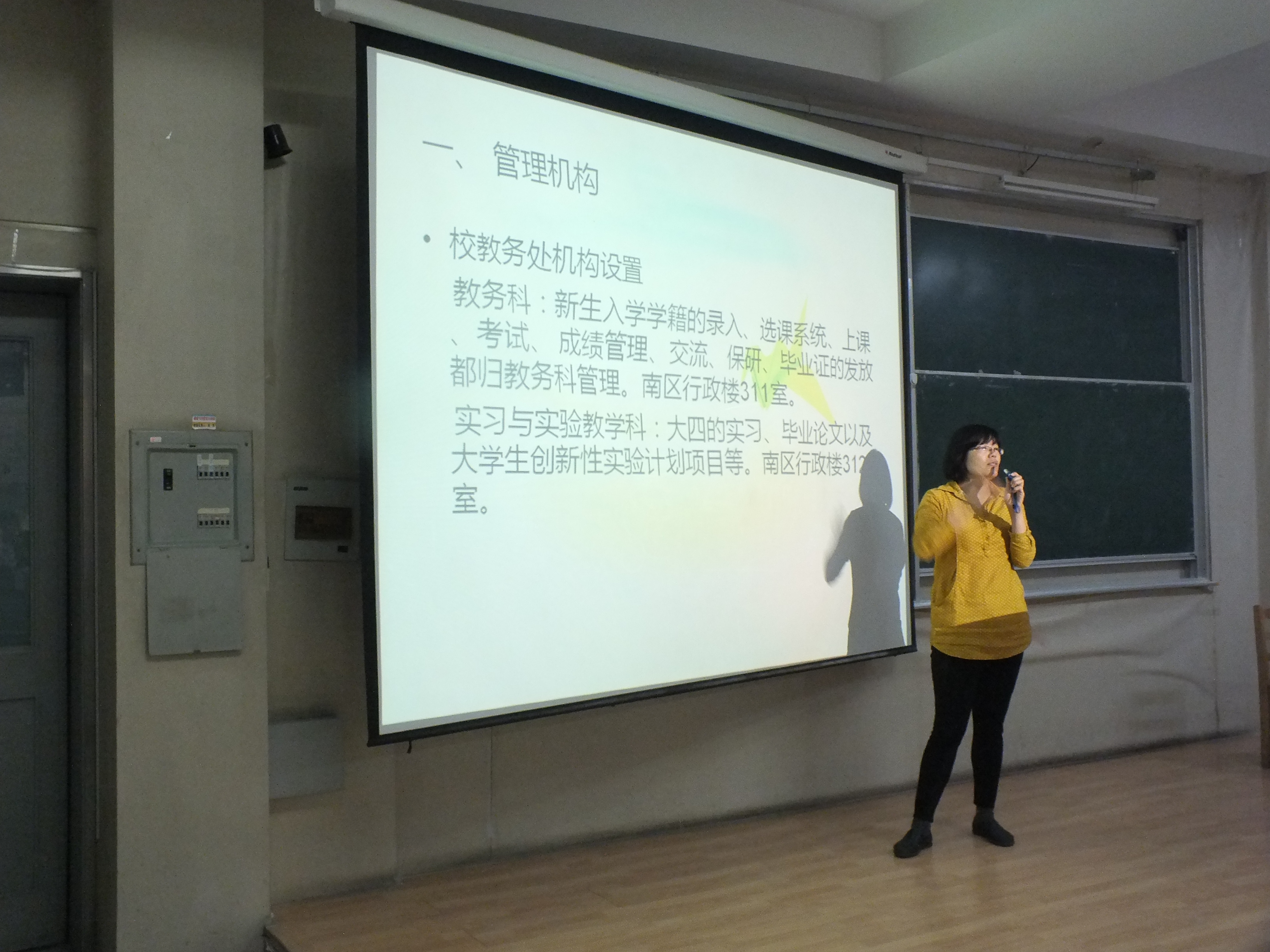的本科生教学管理机构设置向大家作了简要介绍,指出新生首先要了解大学的精神,以全面的视角认识大学的理念、功能,作好自我定位,在学习生活中要明确自己的学习目标,既不要盲目乐观也不要随波逐流;新生同学们还要注意转变学习方式方法,增强自主学习能力,适应大学的启发式教育模式。