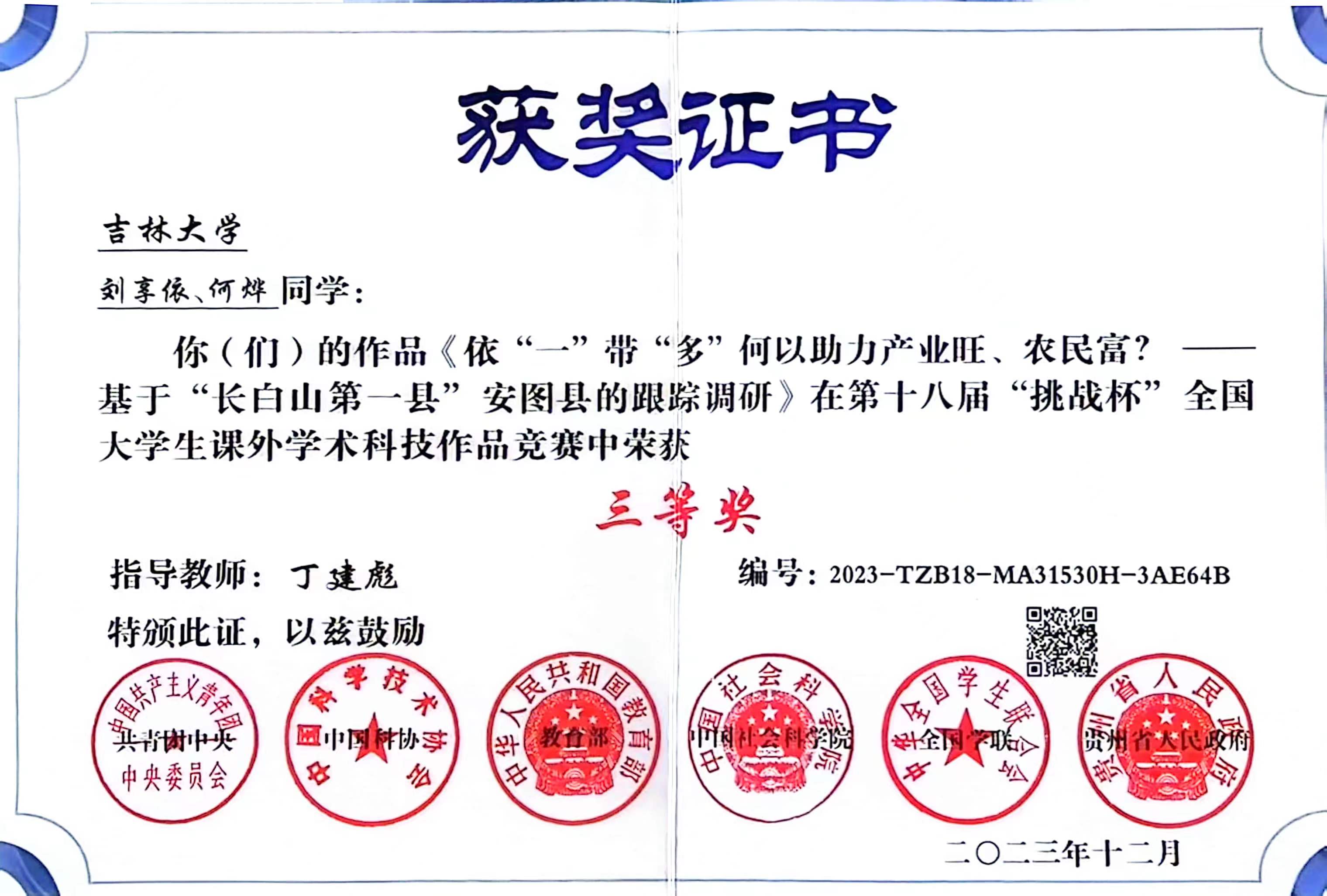 成人抖音 丁建彪教授指导的《依“一”带“多”何以助力产业旺、农民富?——基于“长白山第一县”安图县的跟踪调查》在第十八届“挑战杯”全国大学生课外学术科级作品竞赛中荣获三等奖。