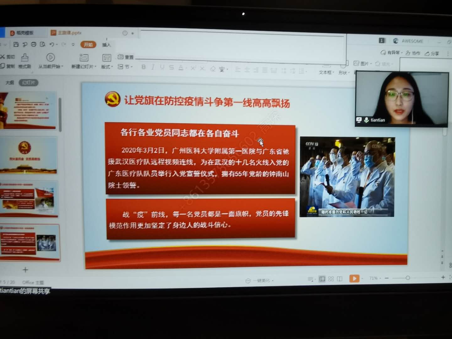 在“七一专题组织生活会”告一段落后,2019级硕士研究生党支部书记杨熙琳为同学们主讲了以“疫情当前:讲奉献谈作为,尽显党员本色”主题微党课。杨熙琳从党员的担当、责任、奉献等几方面为大家讲述了在疫情期间“讲奉献、有作为”的共产党人在各行各业中为打赢防疫战役所做出的努力和贡献,同时还邀请了支部成员刘轶凡、胡竞元同学和积极分子周禹辰同学分别和大家分享了在疫情防控期间自己的志愿者经历和心得体会。