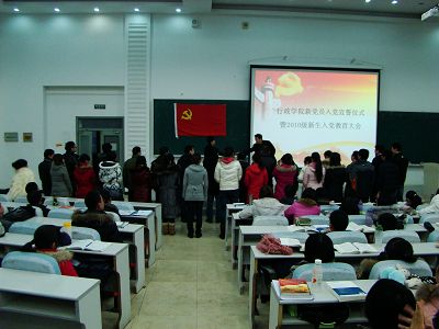 新党员入党宣誓仪式暨新生入党教育大会在雄壮的国际歌声中拉开帷幕,院党委副书记佘彦宣读了新党员名单,新党员面向党旗,高举右拳,在党委副书记许玉镇的领誓下进行了庄严的入党宣誓,铮铮的入党誓词使同学们深切地感受到了加入党组织的庄严与神圣。宣誓结束后,2008级学生梁述清代表新党员发言,他表达了新党员们对党组织的坚定信念,决心不断加强自身学习,提升思想文化素养,坚持党和人民的利益高于一切,认真履行党员义务。