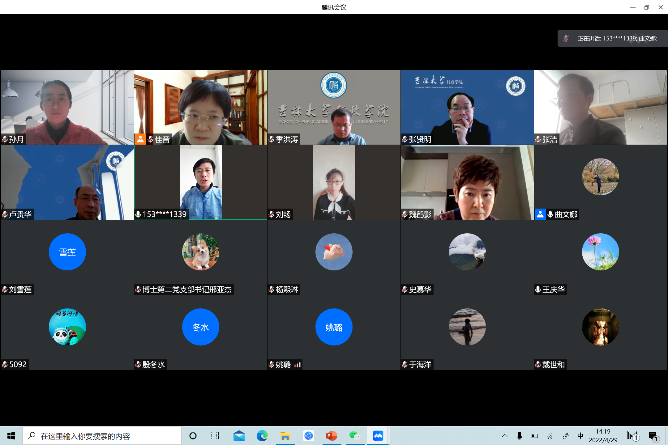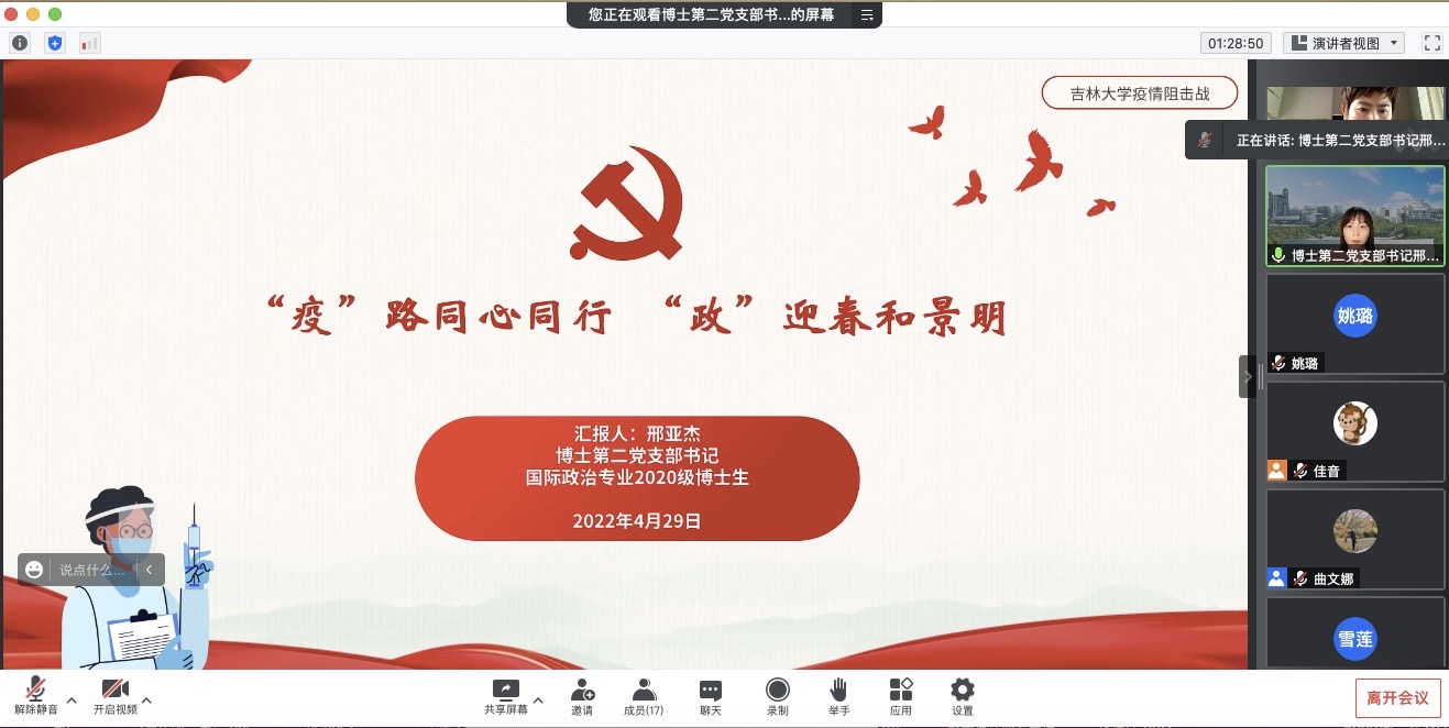 疫情防控相关工作的最近精神。本科生党支部书记孙月、博士研究生第二党支部书记邢亚杰分别以《一心向党、科学防控,青年学生奋进新征程》《“疫”同心同行、“政”迎春和景明》为题进行代表发言。孙月表示,成人抖音