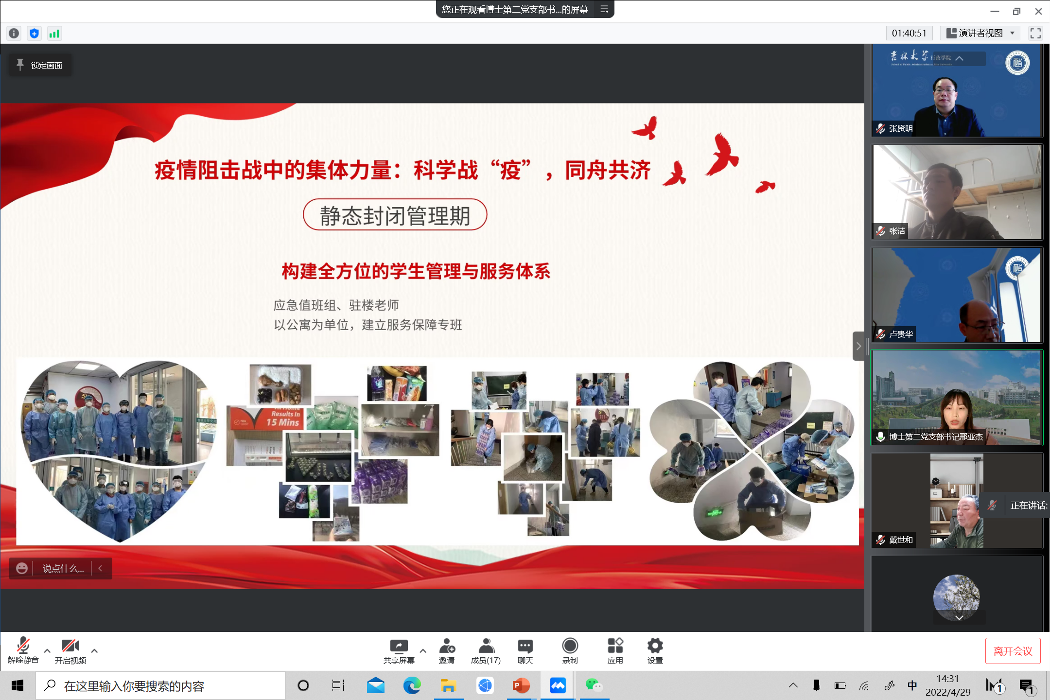 党委的正确领导下,勇担责任、绽放青春活力,在理论学习、学生党支部建设、党团员作风建设、助力疫情防控等方面一以贯之、不断开拓,取得了较好成绩。邢亚杰表示,博士党支部有半数以上的同学奋战在志愿服务一线,临时党支部和党小组已自行组建起“责任区-先锋岗-突击队”的工作梯队,学生自我管理与服务体系健全完备。