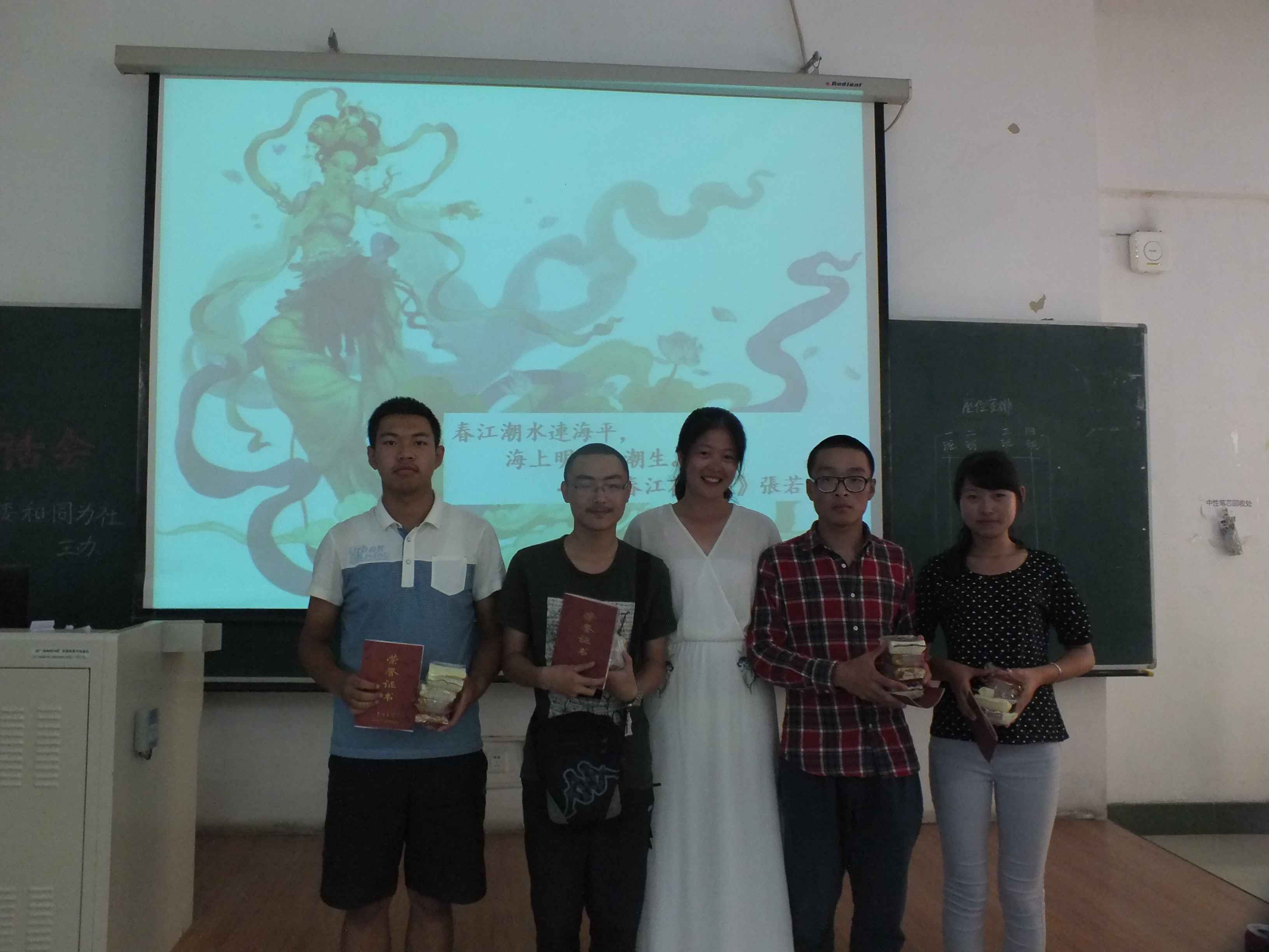 中秋茶话会主要以游戏的方式进行,共设置了“快乐传真”、“歌曲接龙”、“微信摇一摇”、“你来比划我来猜”和“谁是卧底”等五个游戏环节。在游戏环节中,同学们优美的歌声、动感的舞蹈,诙谐的表情、夸张的动作使得茶话会现场掌声不断、笑声不息。在场师生不时互动游戏,让大家充分体会到了行政大家庭的温馨与欢乐。游戏过后,辅导员刘洋、曲畅竹与2012级同学共同演唱一曲《但愿人长久》,将中秋佳节的美好祝愿送给大家。之后,刘洋与曲畅竹分别为获奖班级颁发奖状与纪念品并合影留念。在茶话会的最后,曲畅竹致辞,她希望每位新生能把成人抖音