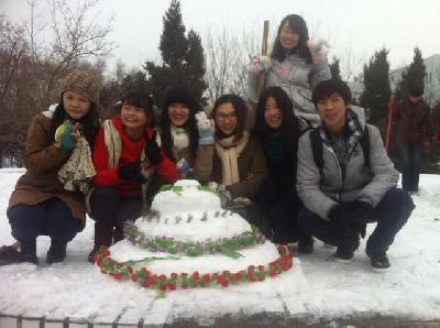 活动开始,外协负责人邓国松首先指出在当今全球化环境下英语的重要作用,随后全体成员齐声喊出口号:“English,a piece of cake”。嘹亮自信的嗓音营造了疯狂英语氛围,在互动环节中,成员在雪中分享自己的英语学习经验,与他人交流心得,浓烈的学习气氛将活动推向高潮。随后进入分组比赛环节,5人为一组,每组通过推荐或自荐的方式选出最有勇气的队员,最清晰、最大声、最流利地朗读英语,挑战自我。最后,为发挥成员创造力,培养团队协作精神,主办方设置了雪地创意赛,以组为单位创造雪上作品。活动结束前,全体成员齐心协力,共同堆砌写有“奋斗青春最美丽”的雪墙,并再次以口号明志。
