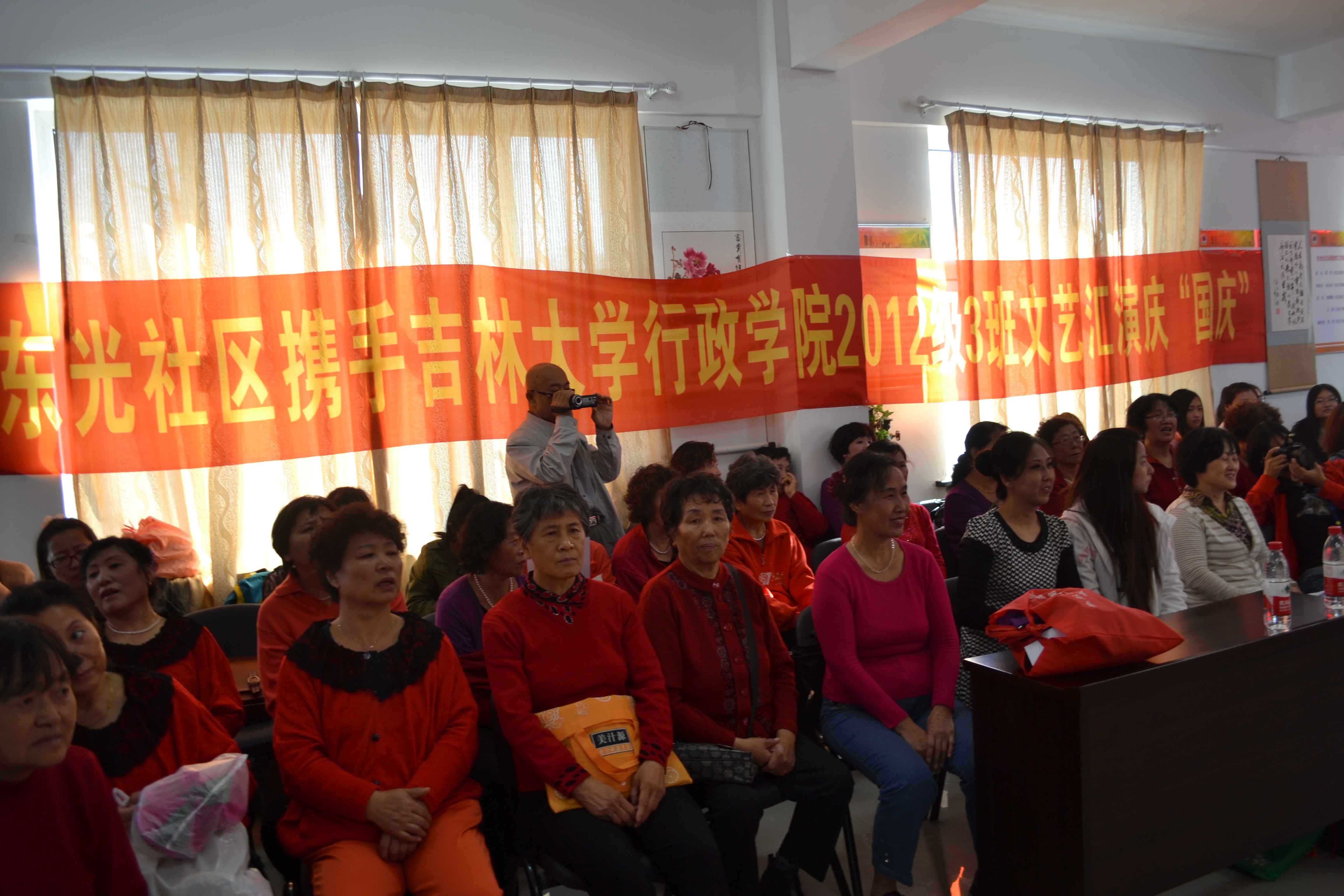 活动伊始,东光社区书记曹伟作了简短讲话,曹书记高度赞扬了行政学子积极走进社区参加志愿服务的行为,并预祝活动圆满成功。随后,联欢活动正式拉开序幕。社区老年艺术团和居民群众先后表演了京剧选段、红歌大合唱等节目,他们用嘹亮悦耳的歌声表达了他们幸福喜悦的心情。在欣赏过社区居民的表演后,三班同学也纷纷带着精心准备的节目登台表演,为祖国生日献礼。一首《祖国颂》的诗歌朗诵抒发了当代大学生对祖国深深的热爱之情;王森岩同学演唱的《十年》美妙动听,赢得阵阵掌声;最后,文艺表演以三班女生表演的《青花瓷》集体舞蹈作为结束。一个个精心准备的节目充分展现了多才多艺的行政学子昂扬进取、积极向上的精神面貌。在精彩的文艺表演之后,同学们还积极主动地和前来观看节目的老人积极交流,倾听老人们的故事,并把部分空巢老人所面对的实际困难和居民对社区共工作的意见反映给社区工作人员,以此来帮助老人们解决生活中的问题。