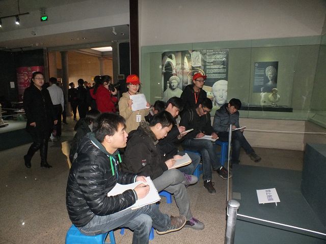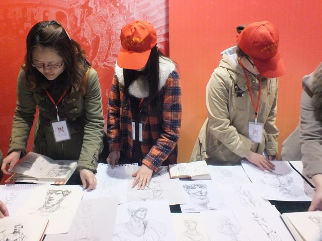 手语教师杨帆的带领下,41名聋哑学生分别走进吉林省博物院的《辉煌时代——古罗马帝国文物展》展区和《瓯骆风 八桂情——广西民族历史文化展》展区,来自千年之前异域的神秘文物、充满民族风情的艺术品让聋哑同学感受到了艺术的熏陶。在老师的建议下,同学们选择好自己喜爱的雕塑模型,架起画板、拿好画笔,开始了现场临摹。临摹过程中,有的志愿者尝试着与聋哑同学进行简单的交流与沟通,为他们素描提供可行的建议;有的则耐心的为聋哑学生指引方向,提供座椅等物品;有的则维护现场秩序,保障本次活动的顺利进行,同时保护文物安全。