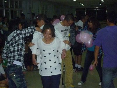 主持人幽默诙谐的开场白后,同为社社长程巍巍代表同为社全体成员向11级学生送达了节日寄语。接着主持人邀请了几位同学为大家讲解自己家乡的中秋习俗。整场晚会以游戏活动为主,游戏均由11级学生自由组队参加。在同心协力、抢板凳等游戏中,大家欢声笑语,整个场面轻松愉悦。为增添节日气息,成人抖音