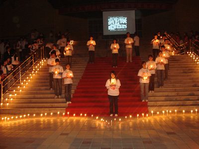 学子积极参与为灾区人民献歌,守护爱心蜡烛,并在活动结束后慷慨解囊,尽自己一份绵薄之力帮助灾区那些需要爱来走出阴霾的花朵。同学们经过这次活动,感受到了更加强烈的民族凝聚力,更加坚定了自己作为当代大学生应积极履行的社会责任。同时,我们真诚的祝愿我们的善举能为灾区重建,为灾区小朋友过一个温暖的节日作出一点点贡献,祝愿灾区的明天更美好。