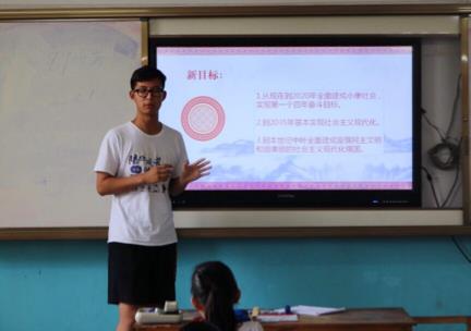 展开合作,开展党的十九大精神宣讲活动。致中支教团遵义分队积极参与到分水镇精准扶贫政策宣讲系列活动中,在分水镇镇政府的指导和支持下,所开展的“分水镇易地扶贫搬迁户后扶之思想训导会”成为分水镇易地扶贫宣讲系列活动的重要组成部分,为分水镇扶贫攻坚工作做出了贡献。合美支教队为六年级的学生们讲了一节特殊的课——《赤子心向党,共建新时代》党的十九大主题班会。队员们以电影《厉害了,我的国》片段开头,让大家感受中国力量。接着对党的十九大精神进行了讲解,带领学生们重温了社会主义核心价值观,启发学生们要勇敢地将自己的梦想融入国家“两个一百年“的奋斗目标中。