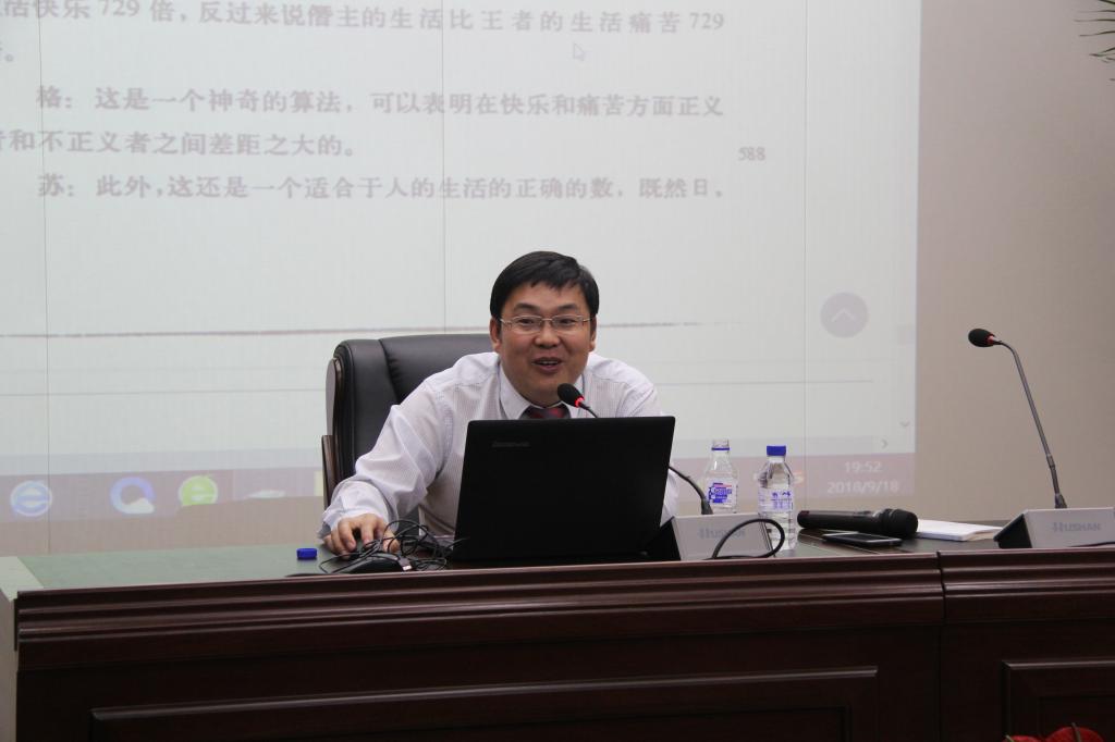 丁建彪老师从解读《理想国》文本出发,向大家说明了各个章节的主要内容,并结合经典片段对重点概念作了深入讲解。他以“灵魂学说及其三分结构”为切入点,对全书的逻辑框架和知识体系进行了梳理,并介绍了国内外研究者的主要观点和相关研究的前沿问题。丁老师的分享详略得当,深入浅出,引人深思。他指出,阅读经典文本的过程本质上是与大师的对话,同学们应深入研读经典文本,提高与大师对话的能力。最后,师生间就研讨主题进行了充分的交流与探讨,丁老师对同学们提出的问题给予了详细的解答。