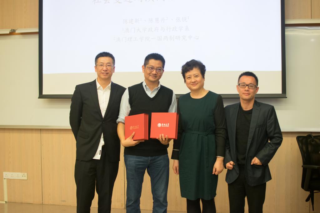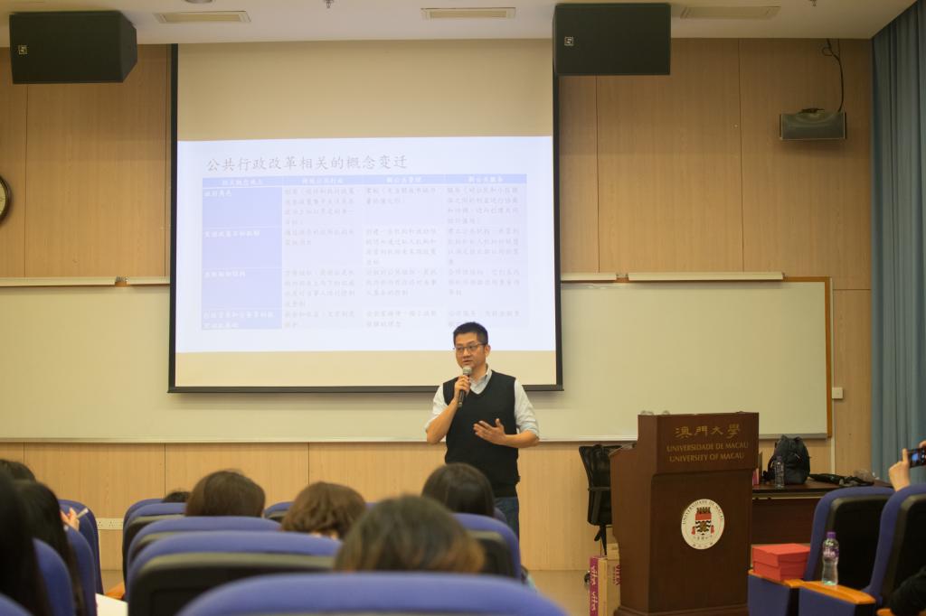 政府与行政学系助理教授陈建新博士,题为“社会变迁对澳门治理的影响”的学术讲座。刘雪华教授介绍了高压反腐下存在的“廉而不为”现象,并从公权力性质,制度诱因和陷阱、公职人员的理性人角色等三个方面分析了其深层原因,探讨了廉能文化建设的必要性及基本路径。陈建新博士以行政改革相关的概念变迁为主要内容,探讨了绩效评估机制、政府规模、政府大数据应用等三个主题。讲座过程中,陈建新博士为在场师生介绍了青岛模式、福建模式、杭州模式、甘肃模式和广东试验等地方政府绩效评估模式,重点对广东试验模式的特点进行了总结。他还介绍了澳门特区政府绩效治理的发展情况,并指出了满意度评价存在的问题。他强调,政府规模小可带动经济增长;体现新公共管理理念的行政改革可提升行政效率;建立“企业型政府”来提升公共服务质量及效率;数据越大、融合性越高,数据的社会效益便越高。在交流环节中,调研团师生分别就政府购买公共服务的种类和范围、累积性满意度调查问卷使用者忠诚指标解读、智慧城市建设与大数据潜在风险等方面内容与陈建新博士进行了深入探讨。