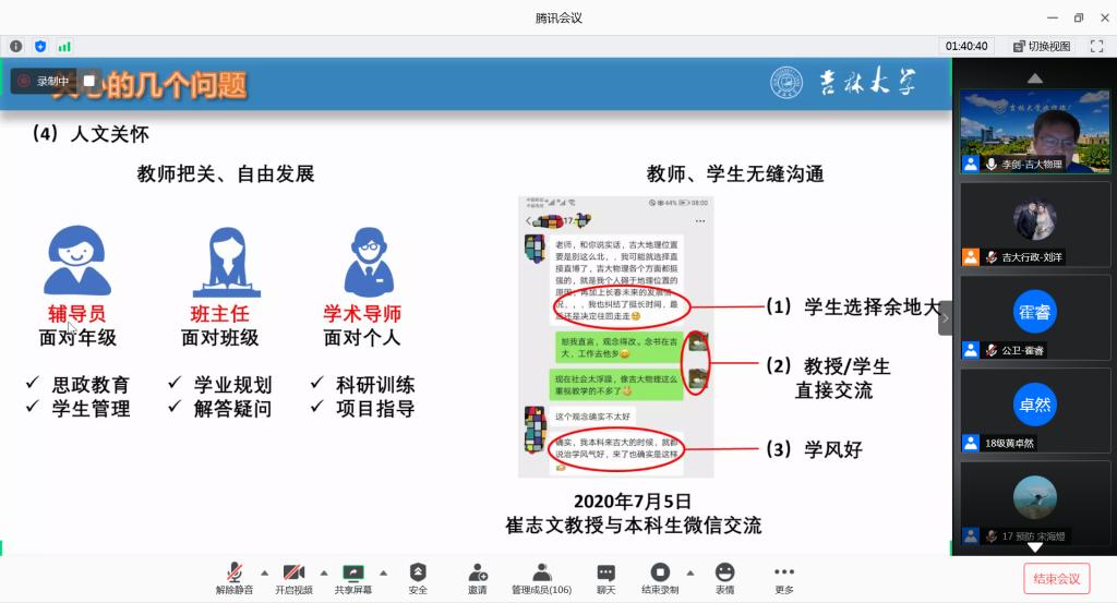 师生代表围绕广大考生和家长在线上会议平台互动留言板块提出的有关录取分数、学习实践和毕业去向等学生培养与发展问题,与大家进行了深入、充分的交流。