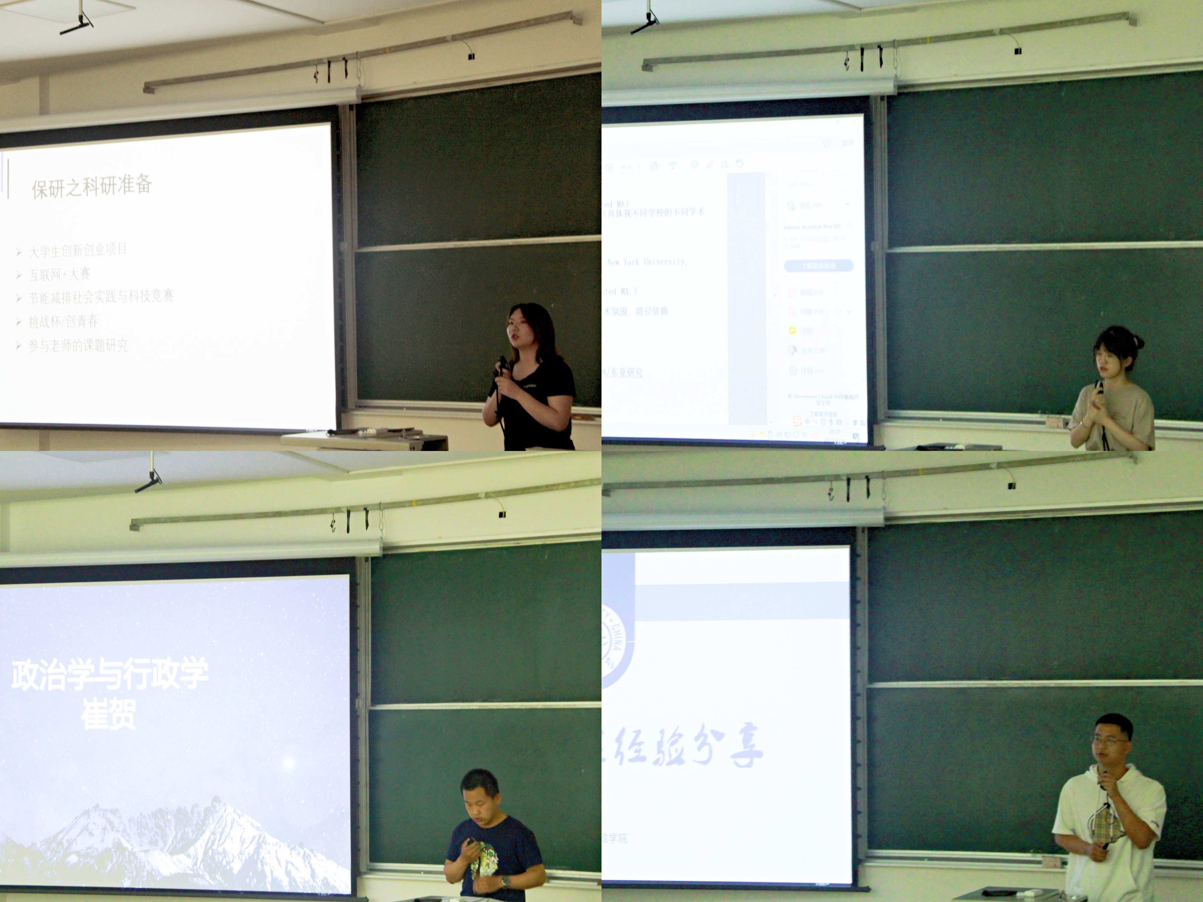 随后,“学业圆梦组”曾倩晓同学根据自身经历,分享了政治学与行政学专业保研线上面试和前期准备的相关经验。孟从华同学详细介绍了自己的保研经历和自己丰富的学生工作经历。赵书韫同学结合自身实际,介绍了国际政治专业的保研经验,并推荐了相关书目。赵泽兴同学介绍了自己在考研过程中的日程安排,并推荐了优质复习材料,还分享了自己参加外交部选调选拔的经验。樊琳琳同学介绍了行政管理专业的保研情况和自己的准备经验。郑莹同学通过视频分享方式,介绍了成人抖音