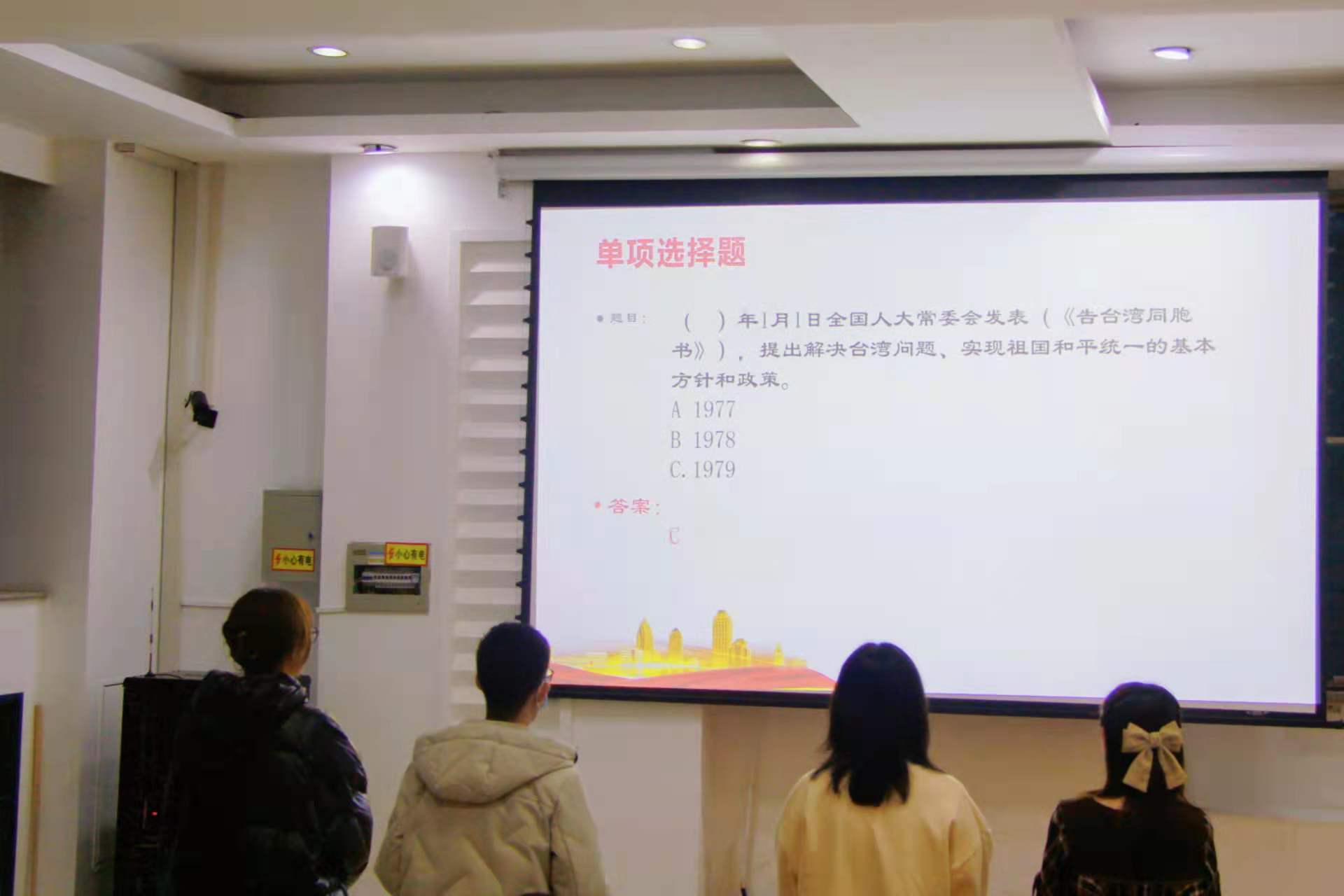 本次知识竞赛共分为初赛、复赛和决赛三个环节。经过初赛的筛选,有10名同学进入复赛,激烈的比拼之后共有6名参赛选手进入决赛,争夺冠军。整场比赛气氛十分热烈又不乏趣味性。经过三个环节的精彩比拼,最终,陈百川(2019级本科生)获得一等奖,赵仕杰(2020级本科生)和戴东亮(2021级本科生)获得二等奖,李怡凡(2021级本科生)、汪嘉慧(2021级本科生)和李垣欣(2021级本科生)获得三等奖,李梓琪(2021级本科生)和卫玉欣(2021级本科生)获得优秀奖。社团管理部主要负责人为获奖同学颁发奖状并合影留念,本次知识竞赛活动圆满结束。