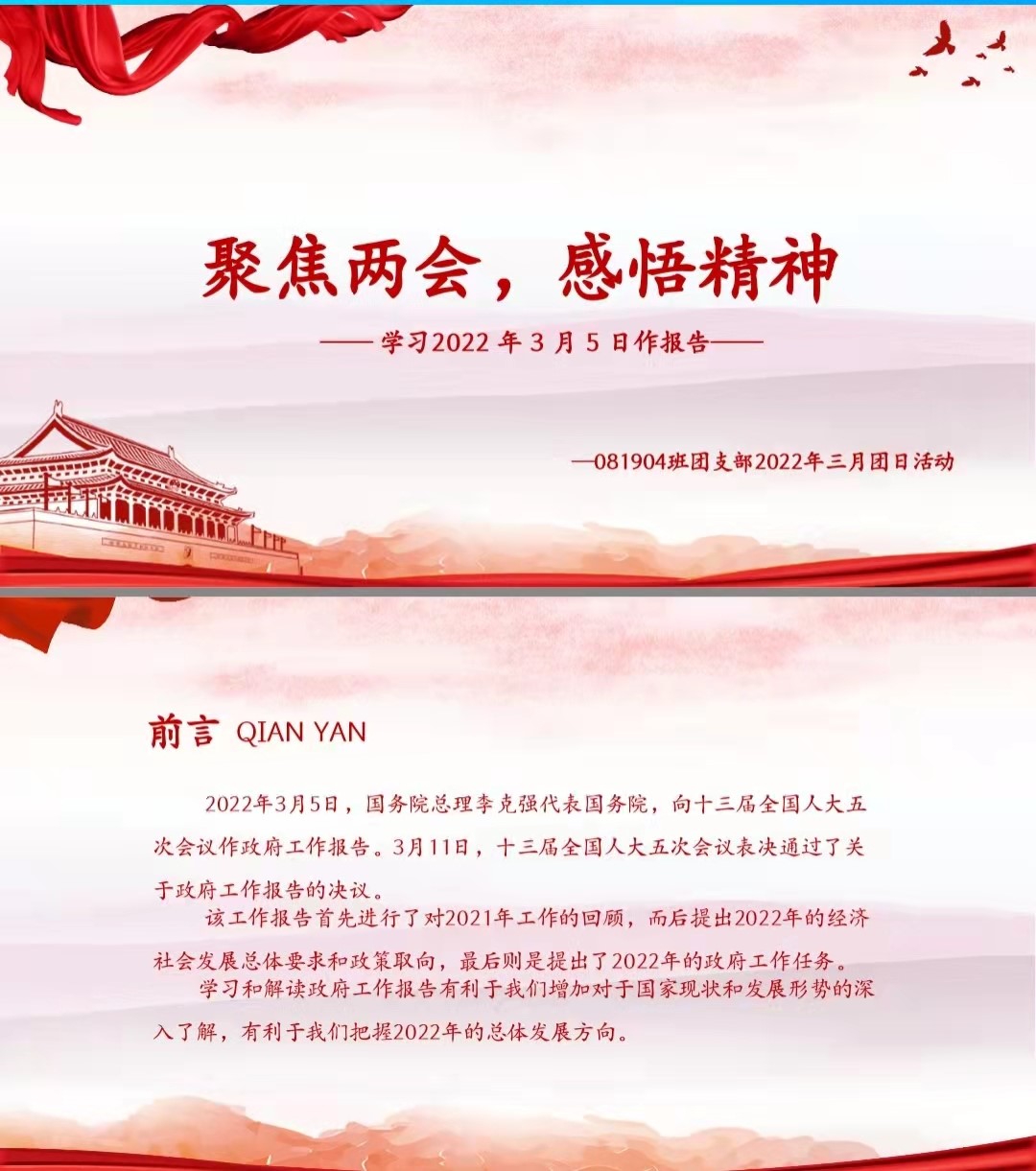 2019级各班团支部开展了主题为“感悟时代,砥砺奋进,聚焦2022年全国两会”的团日活动。