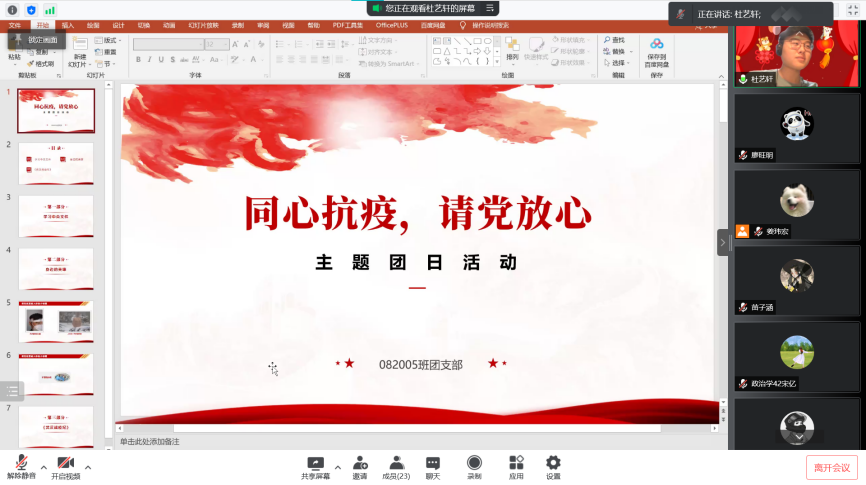 疫情防控过程中辅导员辛勤劳作和学生志愿者积极奉献的画面。朱悦(2020级本科生)着眼生活与工作两个角度为同学们分享了疫情中的感人事迹,并指出人民都承担且完成着自己的使命,共同构筑成了坚不可摧的城墙。最后,同学们互相交流了意见,充分表达了自己对于学习习近平总书记关于疫情防控工作的重要讲话和重要指示精神的心得。同学们纷纷表示此次团日活动收获颇多,并在学习中更加坚定了打赢本次疫情防控阻击战的信心。