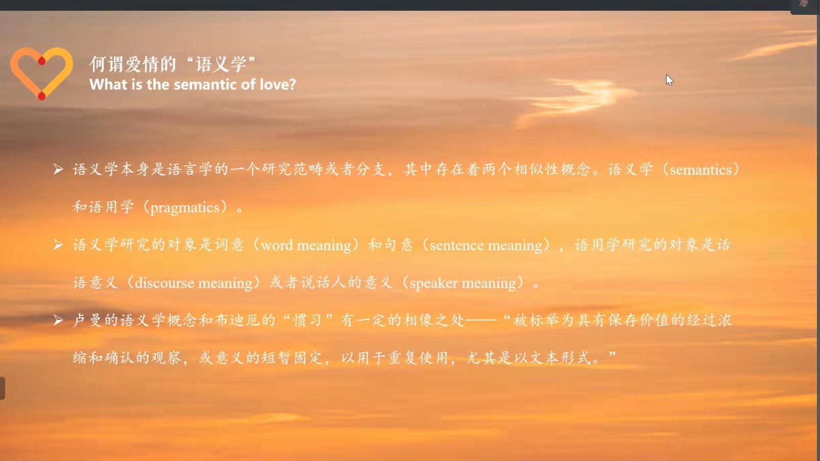 此次是《作为激情的爱情》读书会第三周。领读教师张力伟老师以“爱情的‘语义学’:兼谈知识社会学的一些问题”为主题,介绍了尼克拉斯·卢曼在《作为激情的爱情》一书中的爱情语义学问题,并拓展讲述了知识社会学的基本内容和重要意义。张力伟老师指出,语义学本身是语言学的一个研究范畴或者分支,其中存在着两个相似性概念:语义学和语用学,卢曼的语义学概念和布迪厄的“惯习”有一定的相像之处。此外,张老师还讲述了知识社会学方法与特点,基于此,带领学生们深入理解了政治学研究中的若干方法论问题。