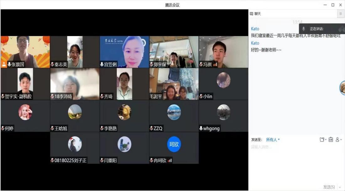 2018级二班的各位同学与龚蔚红、宫笠俐两位班主任老师再聚线上,举行第五期抗疫主题班会。龚蔚红老师首先了解了同学们近期的学习生活状态,帮助大家进行情绪疏导与日常学习规划,提醒大家要遵守疫情防控规定,积极锻炼身体。宫笠俐老师耐心解答了班级同学有关于毕业论文问题,提到同学们要重视毕业论文,多与论文指导老师沟通,规范具体写作格式,同时也要珍惜这次写论文的机会,给自己的本科阶段画上一个圆满的句号。两位老师也为即将读研的同学提出了“提前和导师联系、不要荒废时间”等学业建议。关于班级同学提出的就医、饮食等生活问题,两位老师也及时解答,积极帮同学们向成人抖音