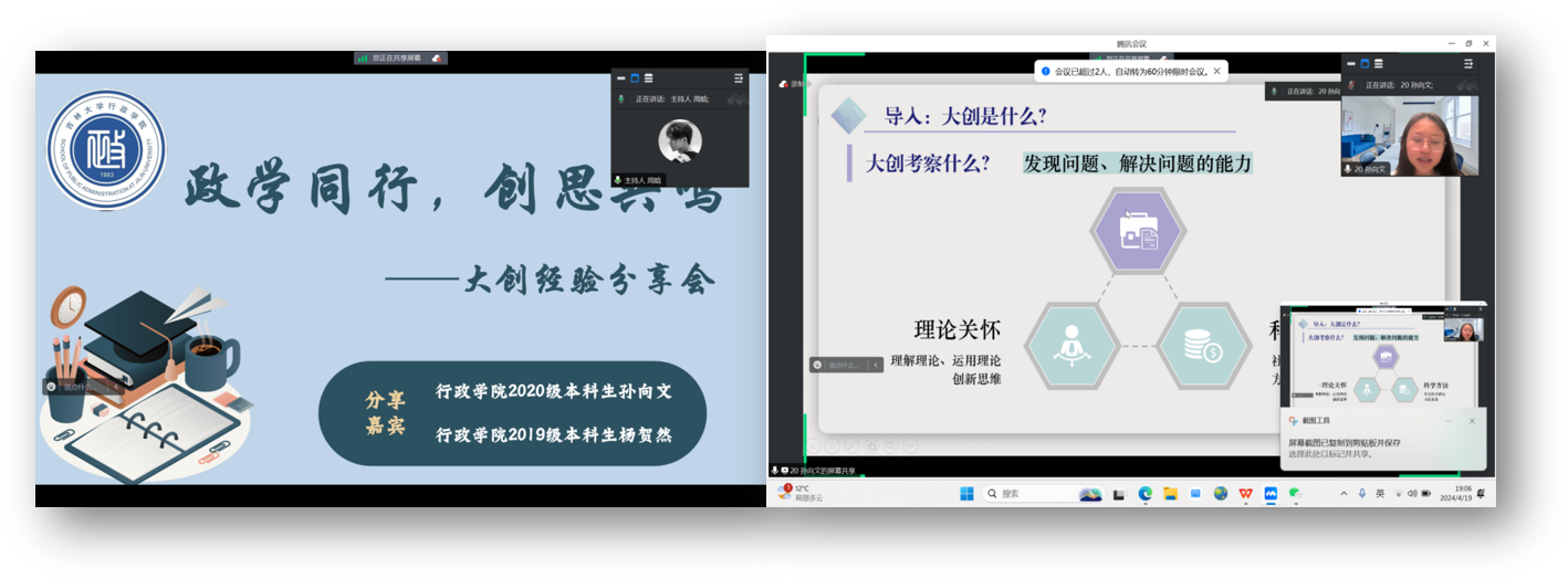2020级本科生孙向文和2019级本科生杨贺然分别以“从组队到立项——大创经验分享”和“大创之路初探——大创相关问题的解读与分析”为题,解答了大家在大创立项、团队组建、导师选择、立项书撰写等方面的疑惑。同学们纷纷表示收获颇丰,今后将以更加积极主动的心态参与到各类创新创业实践活动中,努力在创新创业项目中取得好成绩。