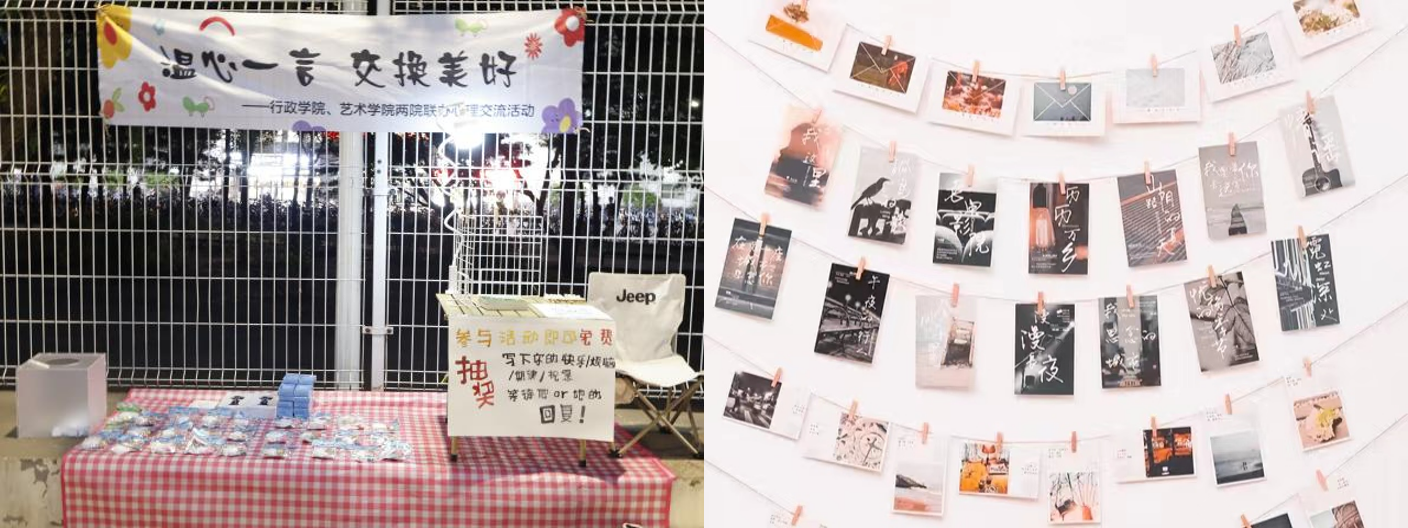 联合举办“温心一言,交换美好”心理交流活动。此次“温心一言、交换美好”活动,通过在南区操场设置“心情交流墙”、悬挂“心灵明信片”的方式,为同学们提供了一个分享心情、交流情感的心理平台,引导同学们感受生活的温暖和美好。在活动过程中,同学们纷纷敞开心扉,书写悬挂自己的“心灵明信片”,分享生活、倾诉烦恼焦虑、祝福路人、展望未来,留言互动间展现出彼此间友好的善意与关怀。辅导员经常性深入学生公寓、教室、体育场馆和餐厅,保持与学生群体的密切联系,在建立友好互信的基础上,定期摸排了解学生思想动态、评估学生心理健康状况,结合院级心理辅导室随时开展谈心谈话、开展心理科普,帮助同学们加强情绪管理、排解焦躁忧虑,共同营造安心、舒心、开心的学习生活氛围。