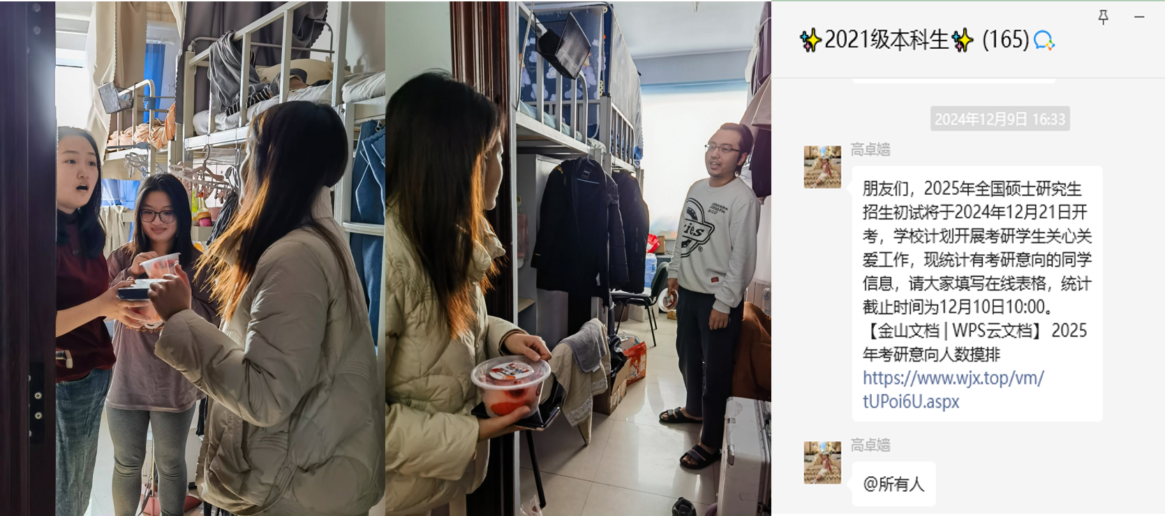 结合本科教育教学审核评估期间掌握到的历届毕业生毕业去向和动态,积极开展硕士研究生考试有关情况调查研究,逐一摸排学生就业意愿,详细了解研究生考试、报名和备考情况,帮助广大学生参加学业启航项目、明辨就业形势、落实毕业去向。毕业年级辅导员本院生源研究生结成帮扶对子,面向应届考生答疑解惑、分享经验。12月19日,辅导员深入毕业年级学生公寓,了解同学们的复习情况,给备考同学加油鼓劲儿,并送上爱心慰问品,排解考生焦虑情绪,鼓励学生从容自信应考。刚刚参加完研究生考试的应届生及往届生来到成人抖音