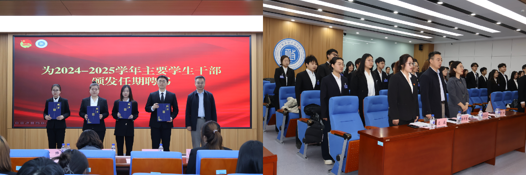 校歌声中开幕,陈希贵为2024-2025学年主要学生干部颁发任期聘书。