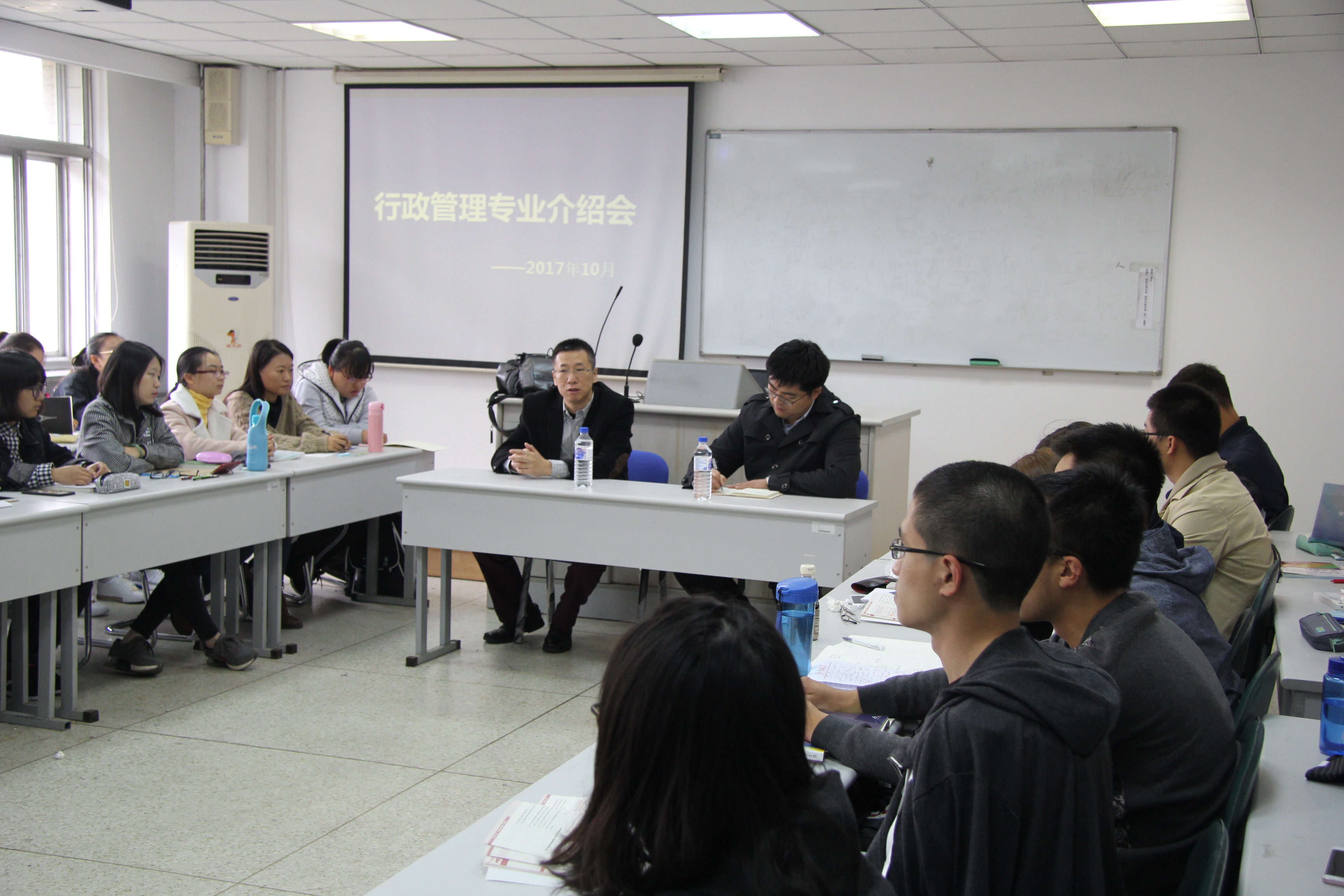 行政管理系2017级本科生专业介绍会于逸夫教学楼MPA教育中心221室举办。行政管理系主任、博士生导师刘雪华教授担任主讲嘉宾。2017级行政管理专业本科生参加了介绍会。介绍会由院学工办主任、2017级本科生辅导员刘洋主持。