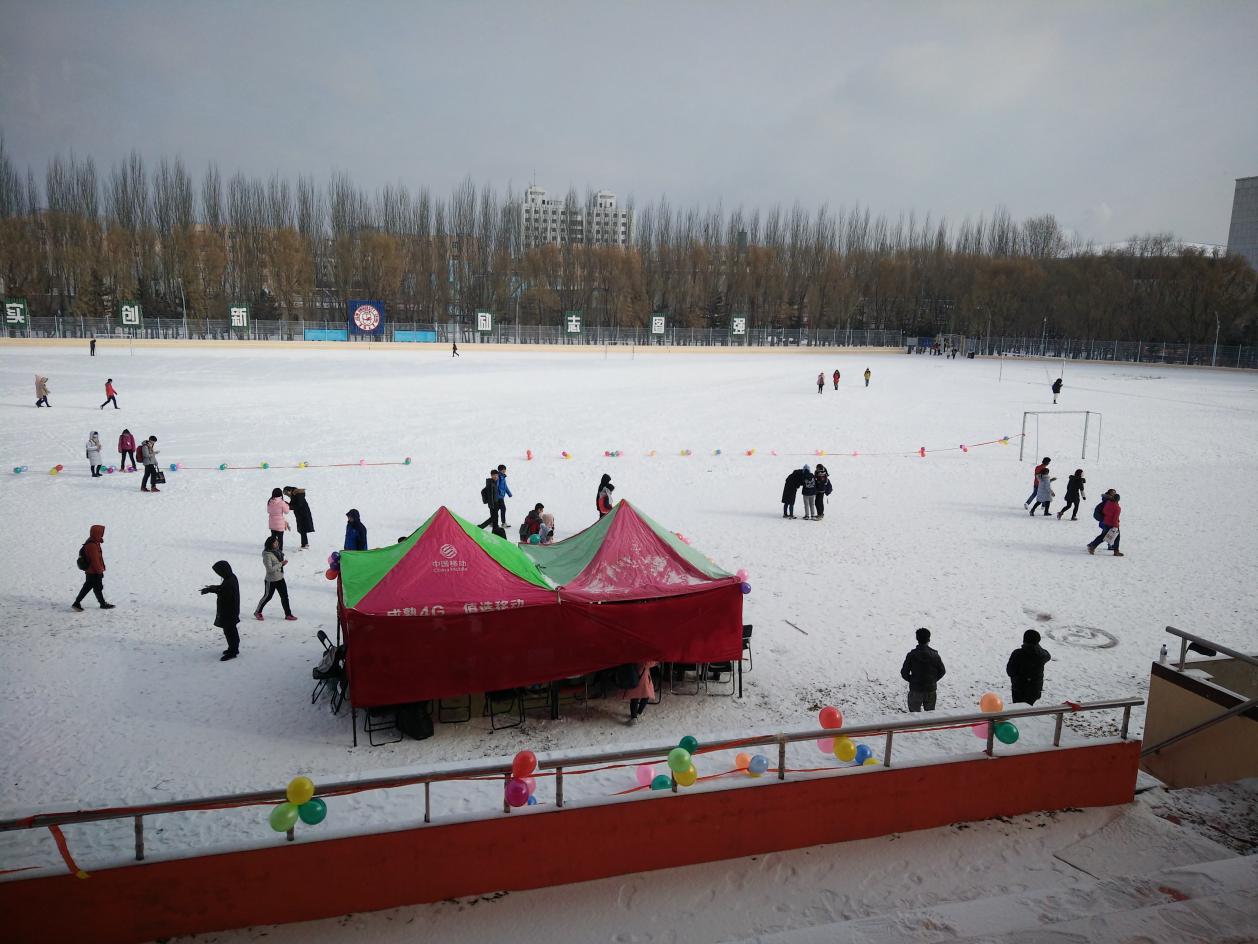 上午7:20, 工作人员在体育场集合,伴随着音乐声和飞扬的雪花开始了准备工作。9:00左右,报名参加的志愿者陆续到场进行登记,等待着活动的开始。面对恶劣的天气,参赛选手们毫不退缩,依旧坚持跑完全程。随着比赛的进行,不断有学生报名参与到活动中来,希望借助活动平台向帮扶儿童表达自己的心意。12:00,比赛准时结束,由工作人员进行场地的清理。