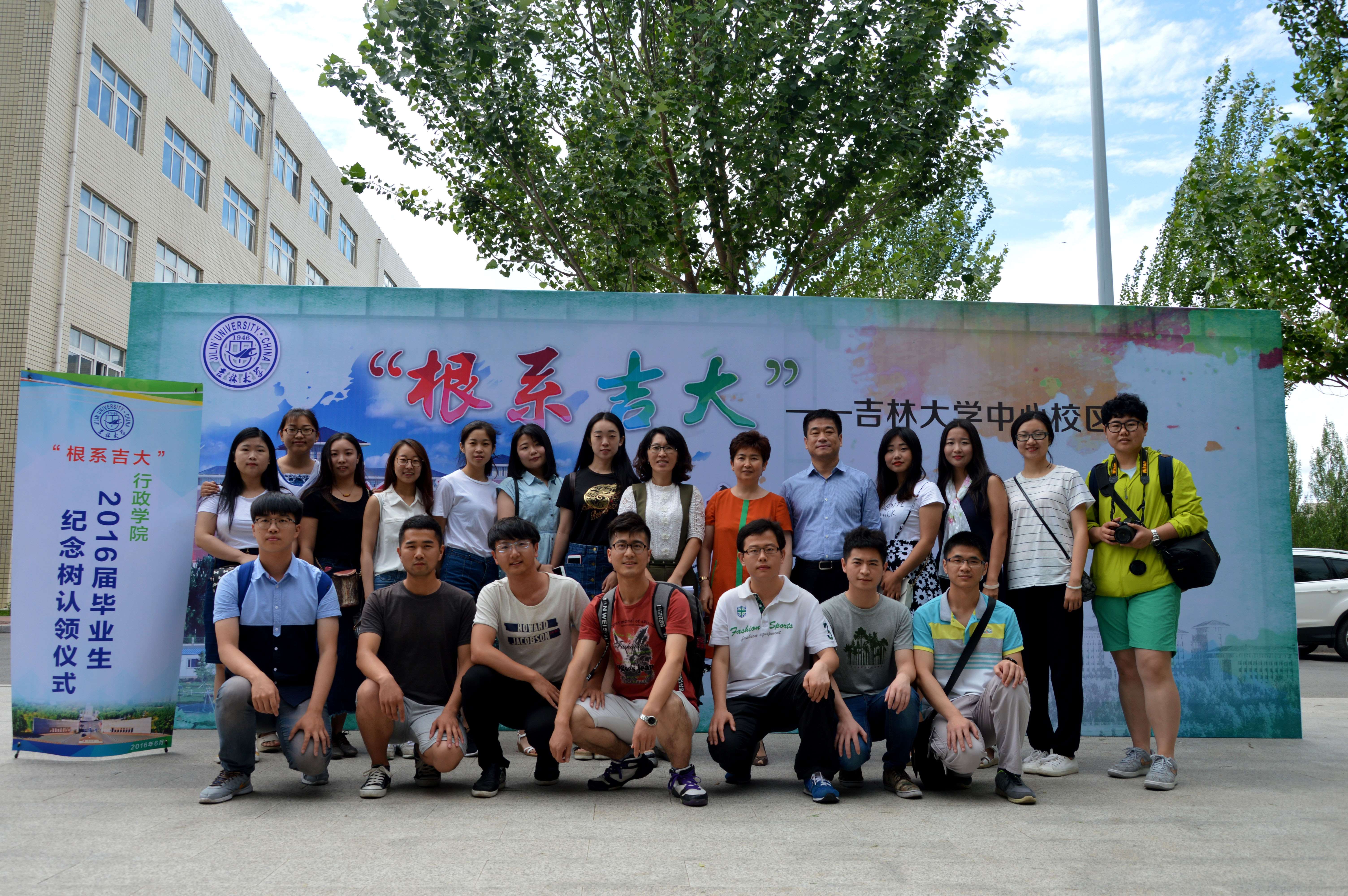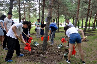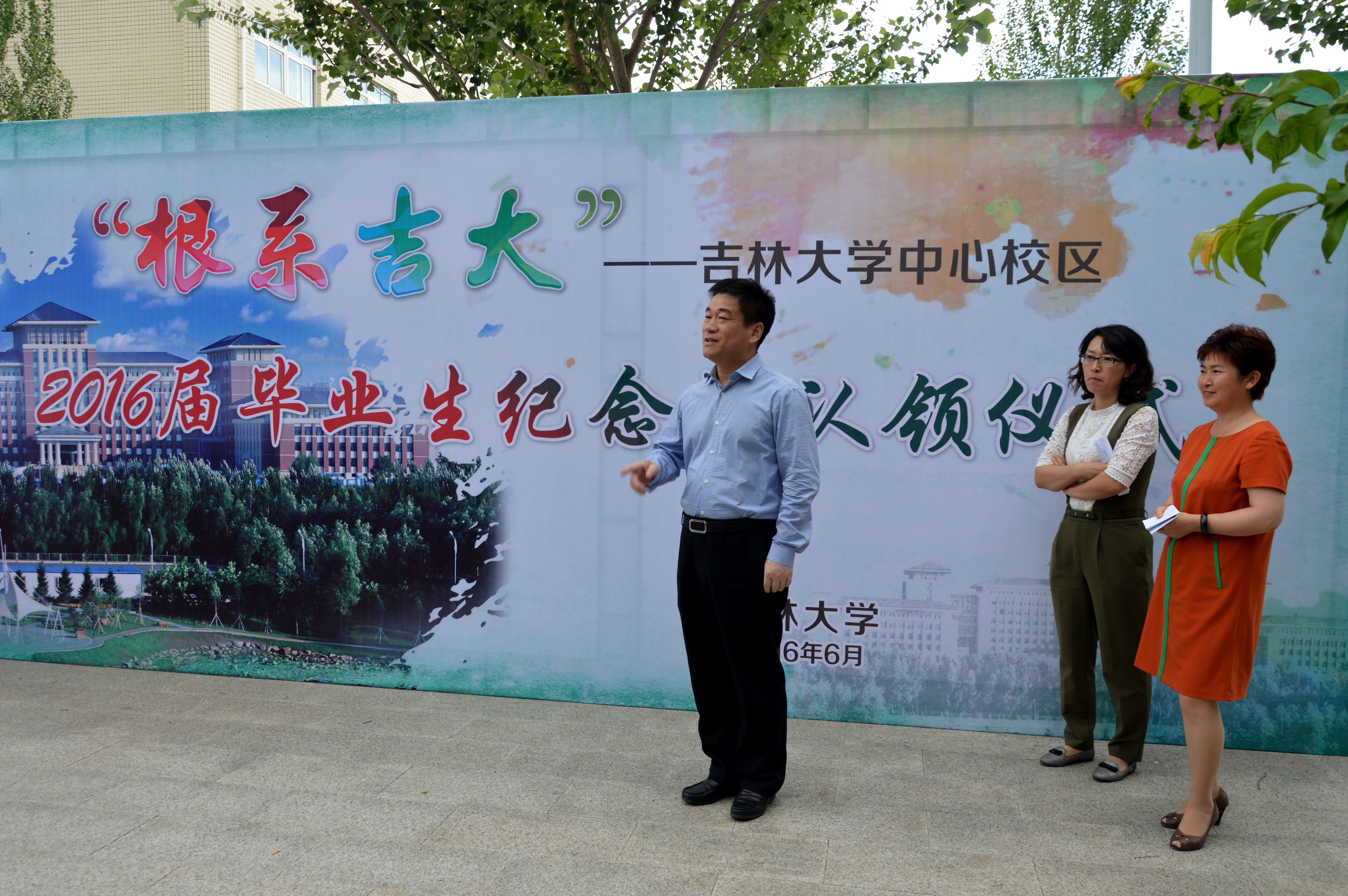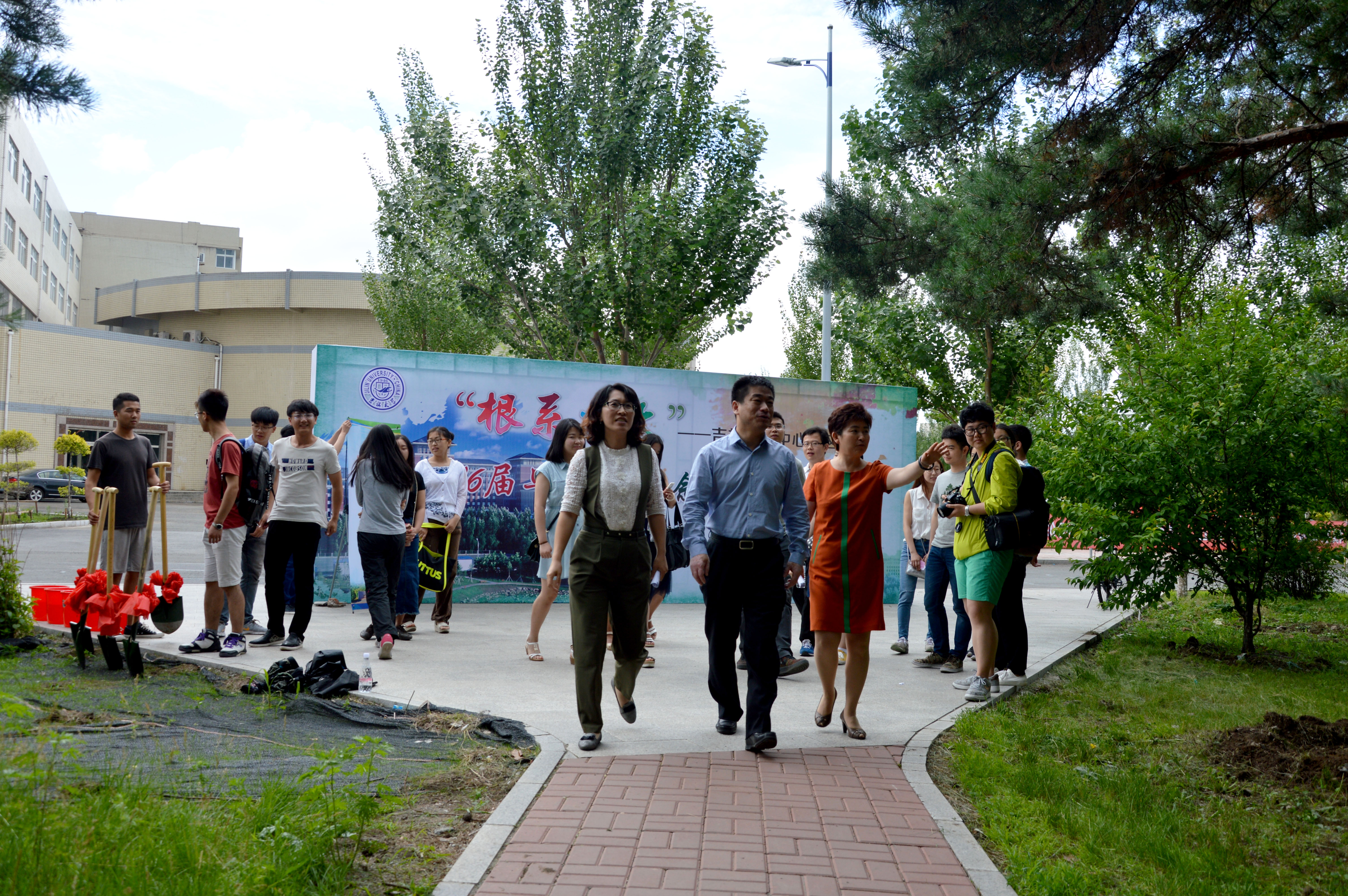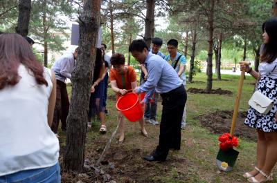 的纪念树下进行铲土和浇水的纪念仪式,并合影留念。