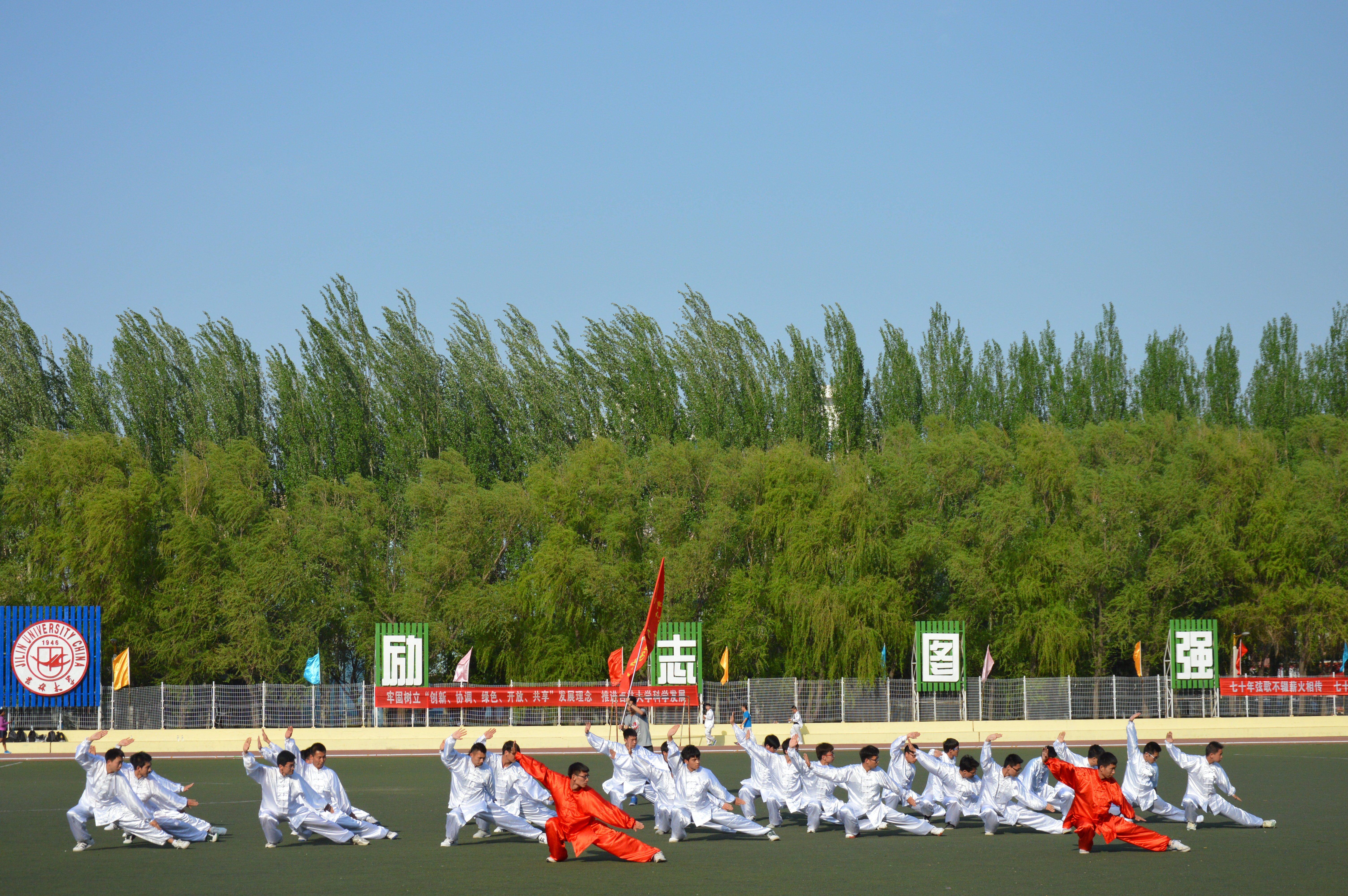 太极拳参赛队迈着整齐的步伐有序的进入田径场并开始了比赛。在李京原(2014级)的带领下,各参赛队员齐声高喊“天下为公,志在大同,文韬武略,问鼎苍穹”的口号有序地跑入田径场。在“敬礼”后,音乐声响起,在李京原的带领下,成人抖音