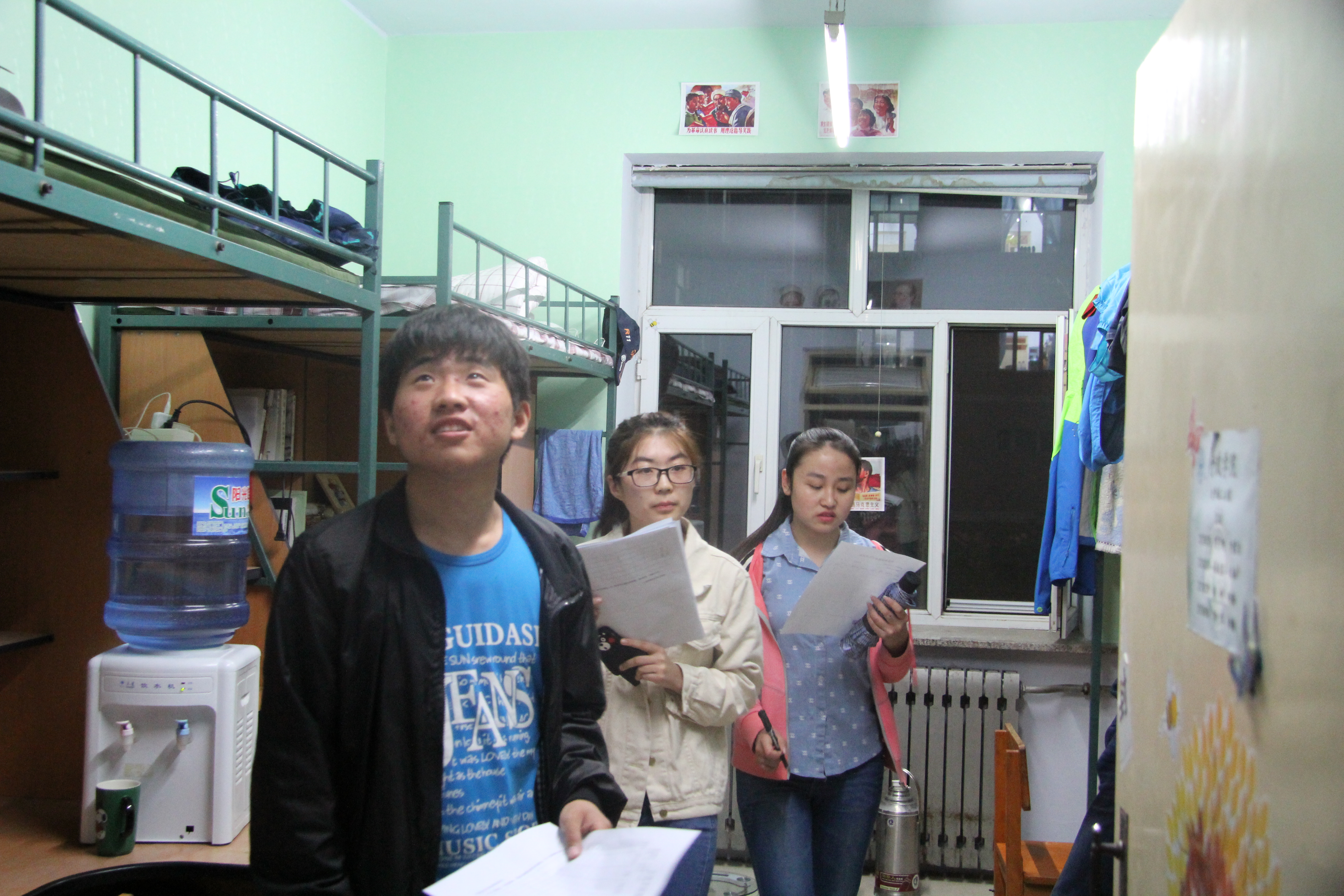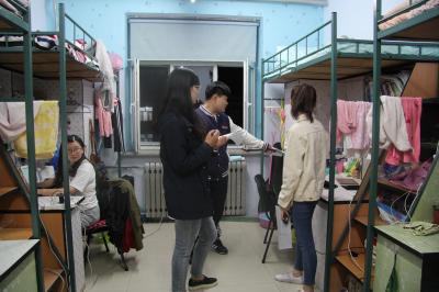 本科生辅导员曲畅竹与生管会学生一同进入大学城学生宿舍,进行查寝活动。