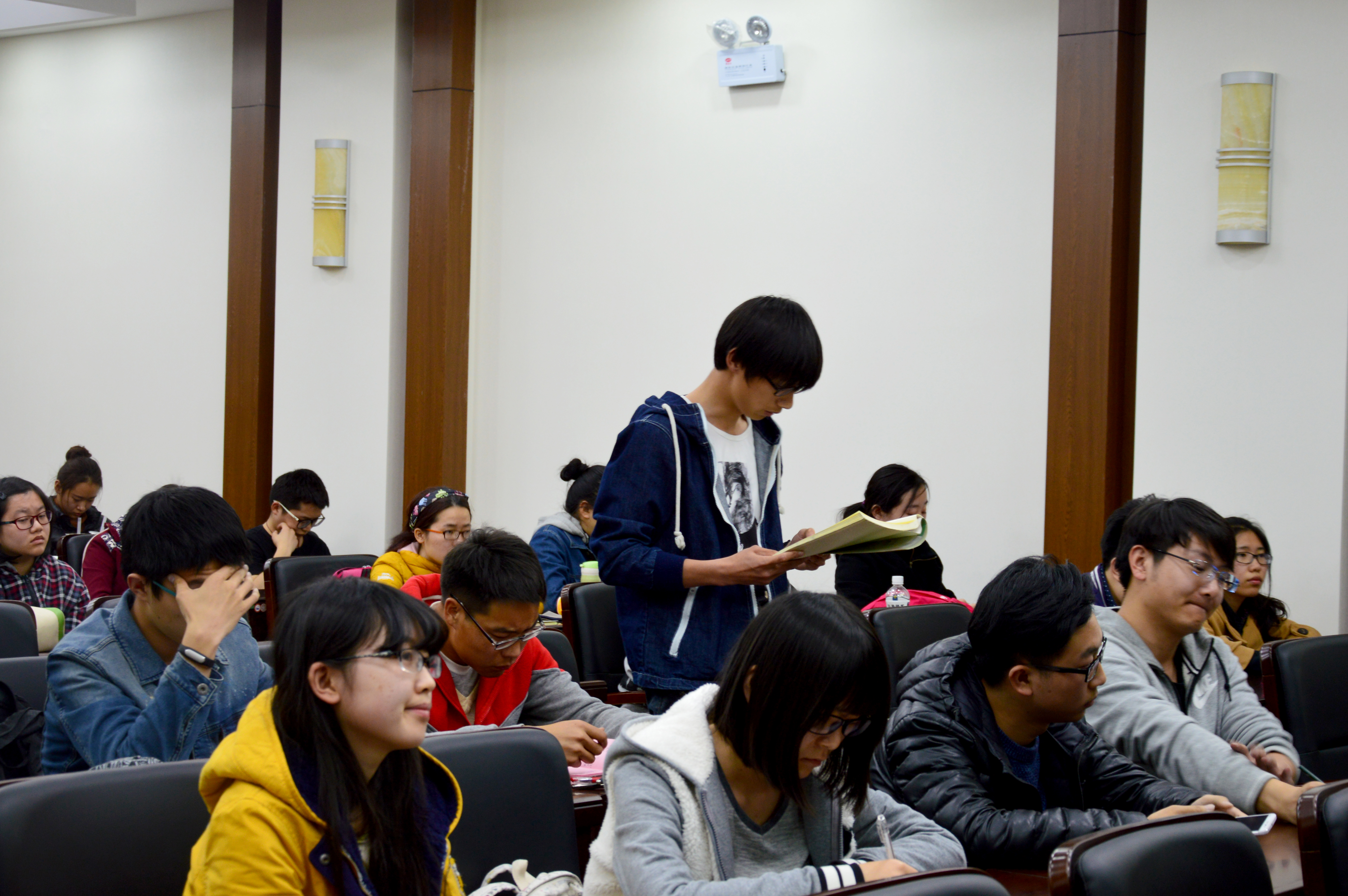 下午6时,讲座正式开始。于君博首先向出席活动的师生介绍了自己所做调查的汇报提纲,即通过研究背景、文献综述、研究设计、研究发现、研究启示五个模块详细介绍研究成果。在第一个模块中,于君博首先阐释了名校选调生的明确概念与出现原因,并指出我们应当充分重视选调生的出现及其背后蕴含的当代青年公共服务心态等社会问题。而在文献综述与研究设计模块中,他展示了自己及团队在研究初期进行的文献搜集和准备工作。本次调查活动采用问卷调查分析与半结构化访谈相结合的研究形式,同时他表示由于研究环境和条件的限制,本次调研仍存在研究视角单一、研究基础薄弱、研究方法粗糙等问题。最后,于君博重点介绍了调研活动的研究发现与启示,通过对回收问卷的效度分析与对访谈对象的有针对性的提问,他发现名校选调生普遍存在生活质量与工作环境等几个方面的差异,而选调政策的较大弹性、当代青年一代生活压力的增大、人职错配与官僚体系的恩庇关系等均是造成选调生幸福指数偏低的重要因素。但同时,于君博还指出尽管选调生目前就职情况较为严峻,但大部分选调生仍对未来持乐观态度,并坚信可以通过个人努力提高自身待遇与生活质量。在调研汇报结束后,于君博与在场学生针对本次讲座的内容进行了互动。同学们大胆提出了自己的困惑,其中涉及的恩庇制度与政治环境中关系网络的利弊探究、高薪养廉与名校人才待遇区别化等问题也引起了在场其他师生的深思。