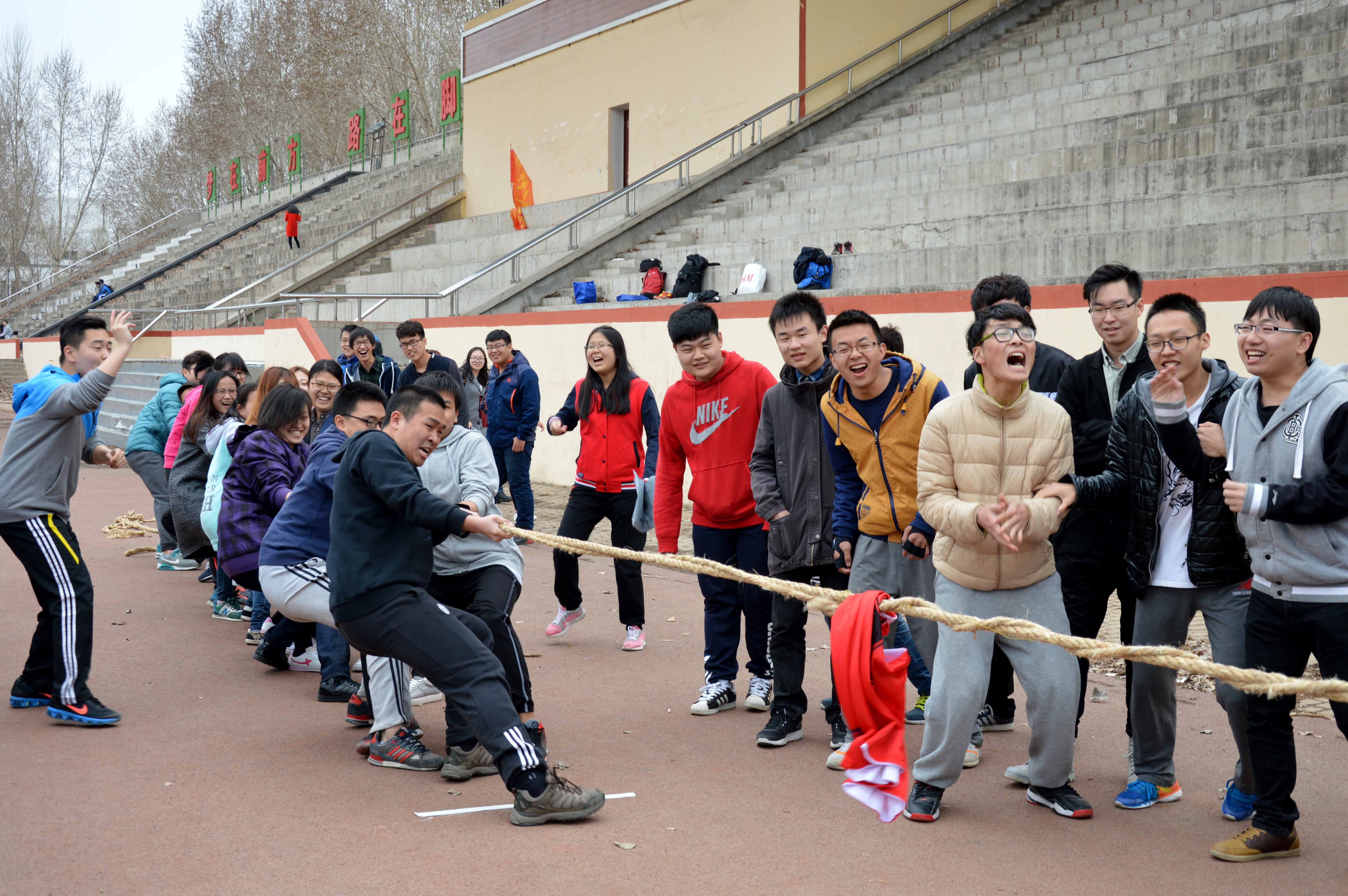 12时整,参赛同学和啦啦队同学准时到达体育场。比赛前,学生会体育部工作人员姜雨男(2015级)宣布了赛事安排和比赛规则。比赛共分为4组进行:081401班VS081402班、081403班VS081404班、081501班VS081502班、081503班VS081504班,规则为一局定胜负。比赛正式开始,各个队伍都喊着自己的口号,以便保持着同样的节奏,朝一个方向用力拉。啦啦队的同学们也在大声为自己的班级加油助威,比赛进展的如火如荼。4组赛事中081503班VS 081504班的比赛最为激烈。比赛一开始,双方势均力敌,两班各自啦啦队的呐喊声和助威声此起彼伏。渐渐地3班占有了相当大的优势,胜利在望。然而在最后关头4班队伍依然没有放弃,在班长的口号指挥下,4班参赛同学齐心协力,每个人都尽了自己最大的努力,最终成功逆转,获得了比赛的胜利。此次获胜的班级为081402班、081404班、081502班和081504班。