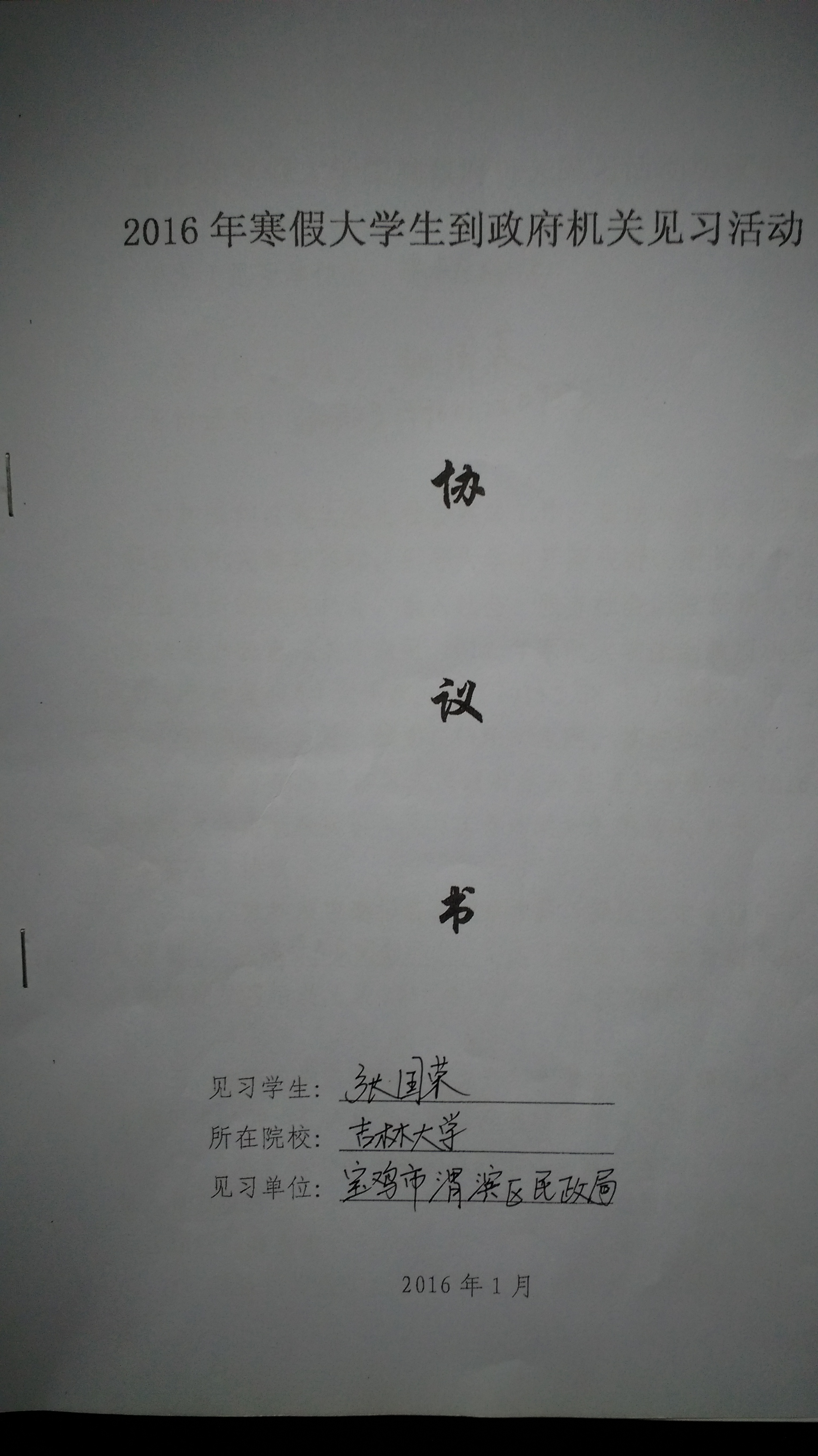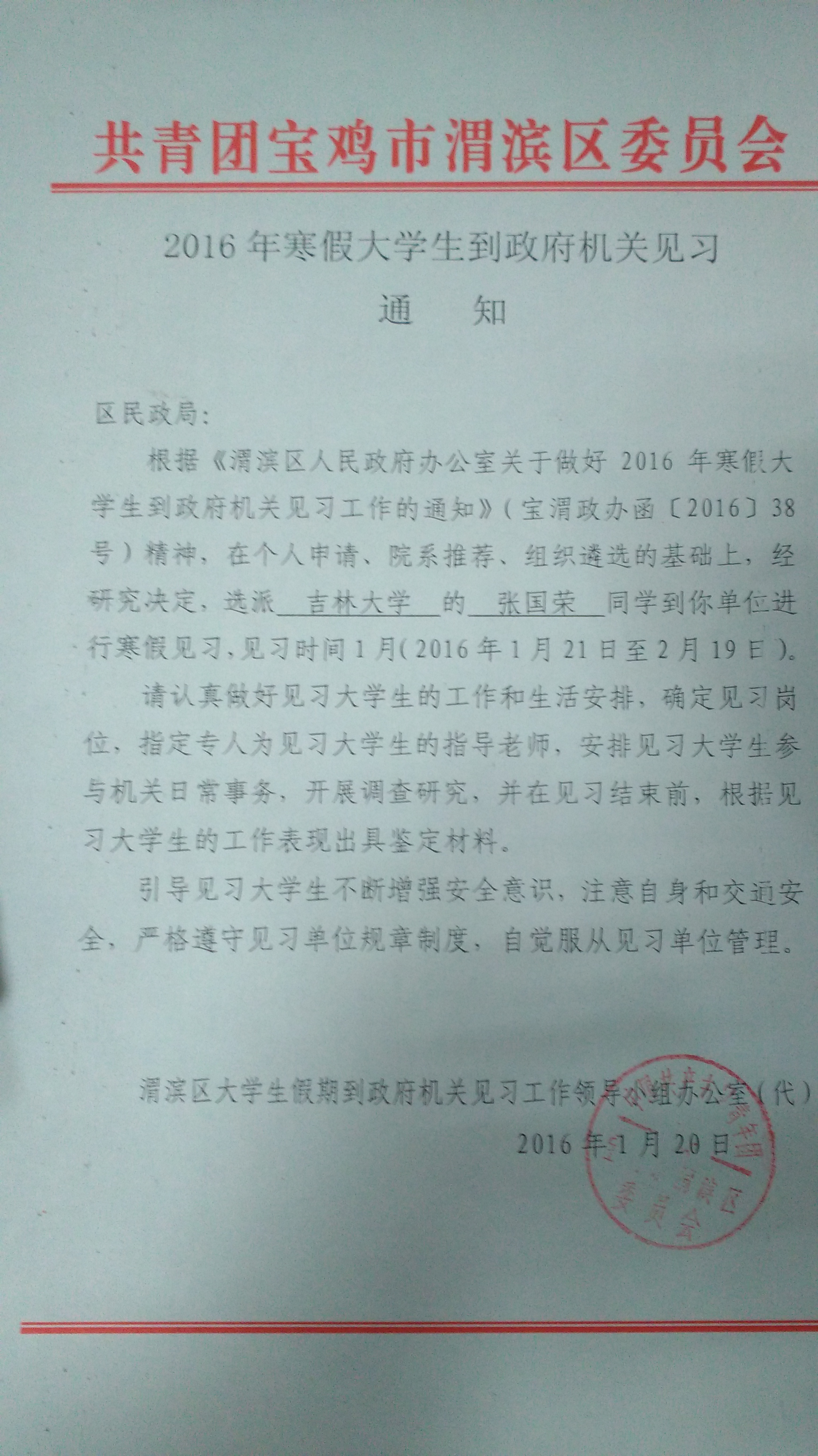 2014级本科生张国荣于2015年12月21日在陕西省宝鸡市渭滨区民政局开展为期一个月的见习工作。