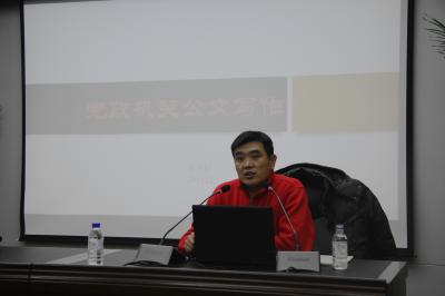 潘洪阳副教授。潘洪阳从事公文写作多年,积累了丰富经验。在此次培训大会中,他主要围绕党政机关公文写作来讲述公文写作的要领和技巧,着重论述了党政机关公文的含义与作用、党政机关公文的一般写法、以计划的写法为例等问题。对于党政机关公文的含义与作用这一问题,潘洪阳深入浅出地进行剖析,使同学们深切认识到党政公文写作的重要性。关于党政机关公文的一般写法方面,他主要从写作前的准备、总体要求、公文的结构三个层面展开论述。以做计划为例,潘洪阳以具体的计划公文为例从计划的开头、主体和结尾3个部分展开论述,详细地向同学们介绍了党政机关公文写作的标准格式。在此次活动中,潘洪阳以简洁的语言向我们系统地介绍了党政公文写作的要求和方法,获得大家的一致好评。