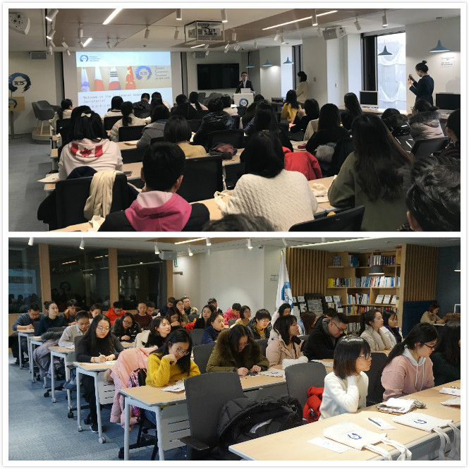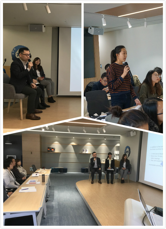 12月18日,调研团来到韩国首尔市中日韩三国合作秘书处访问、调研。期间,经济事务处处长乔文以及社会文化事务处处长Nagafuch,Kenji分别对于中日韩三国秘书处总体情况作出的介绍。在讲座中,他们从发展历程、职能与活动以及组织结构三方面向调研团师生介绍了中日韩三国合作秘书处的情况。秘书处的发展历程是由第二次中日韩领导人会议期间,三国领导人同意建立三国合作秘书处开始,经历签署《关于建立三国合作秘书处的备忘录》直至签署《关于建立三国合作秘书处的协议》,三国合作秘书处于2011年在首尔正式建立,至此已经经历了四次换届;主要职能与活动在于支持三国磋商机制、宣传三国合作、开展合作项目、与其他国际组织交流合作以及研究及编纂资料库五项,乔文处长指出,目前秘书处也比较注重文化与社会方面的问题,尤其关注青少年的相关问题,并举办了青年大使项目等品牌项目;在组织结构方面,秘书处由协商委员会和四个职能部门组成,协商委员会由一名秘书长和两名副秘书长组成,以协商一致方式就秘书处日常工作做出决策。协商委员会下设政治事务处、经济事务处、社会和文化事务处以及综合处四个职能部门。期间,调研团师生就如何申请在国际组织实习等问题提出了疑问,秘书处相关人员也做出了详细解答。