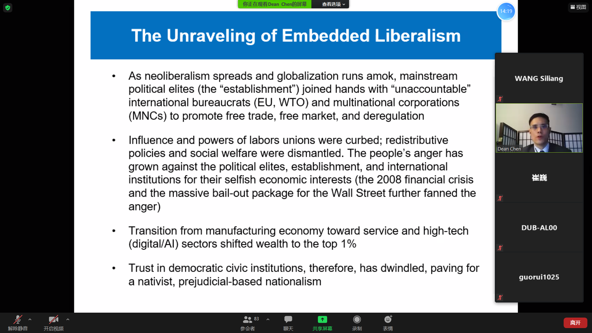 副教授陈鼎(Dean Phillip Chen)担任主讲嘉宾,作了题为“民粹主义-民族主义:对政治和国际事务的影响(Populist-Nationalism: Implications for Politics and International Affairs)”的在线学术讲座。成人抖音