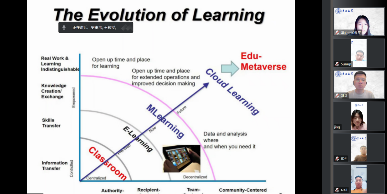 523日,系列讲座第四场,王敏娟教授为研究生同学分享了教育元宇宙的相关内容。王敏娟教授指出,自从2022年起,元宇宙一直备受关注,被认为是第三次互联网革命的浪潮。元宇宙利用稳定互联的在线3D虚拟环境(3DVE),为学习和协作提供了全新的社会链接方式,带来了巨大的机遇。王敏娟教授强调,如何在教学中有效地设计和利用元宇宙是优化学习体验的关键。元宇宙为学生提供了身临其境的学习环境,可以模拟真实场景,促进互动和合作。学生可以通过虚拟实践来巩固理论知识,参与沉浸式的学习体验。这为教育带来了许多机遇,例如跨文化交流、远程教育和个性化学习。不过王敏娟教授也指出了元宇宙应用中的挑战。首先是技术方面的挑战,包括虚拟现实技术的成本和可靠性、网络带宽和安全性等问题。其次是教育设计的挑战,需要教育者重新思考教学方法和评估方式,以适应元宇宙环境下的学习需求。此外,王敏娟教授还提醒各位同学关注数字素养和信息素养,确保自己能够有效地利用元宇宙进行学习和协作。