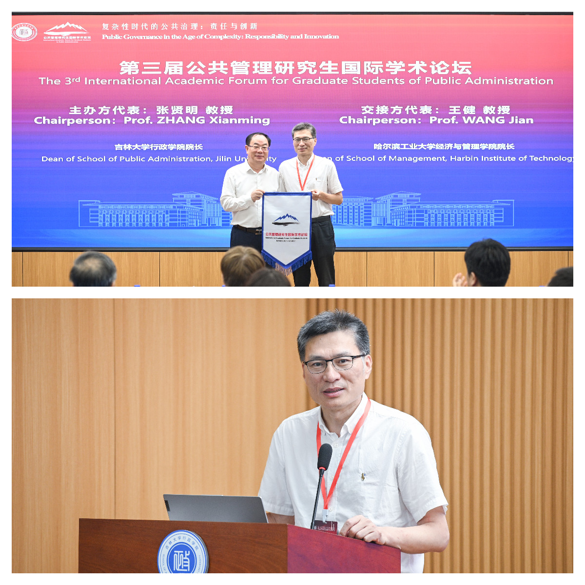 代表王健教授进行公共管理研究生国际学术论坛会旗交接。王健表示,前三届公共管理研究生国际学术论坛的成功举办,是公共管理学科学术质量发展的重要标志,哈尔滨工业大学将学习第三届论坛线下举办的成功经验,作为下一届论坛主办方代表,诚挚邀请在座师生共赴哈尔滨之约。