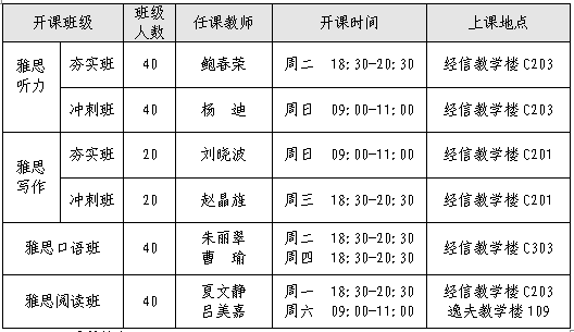 本学期雅思课程每周开设雅思听力班(分为听力夯实班、听力冲刺班)、雅思口语班、雅思阅读班、雅思写作班(分为听力夯实班、听力冲刺班)4个班级,11月11日开课。每班每周开课2次(夯实班、冲刺班每周各开课1次),每次2个小时,课程共计五周,预约一次即可参加该班级5周课程。