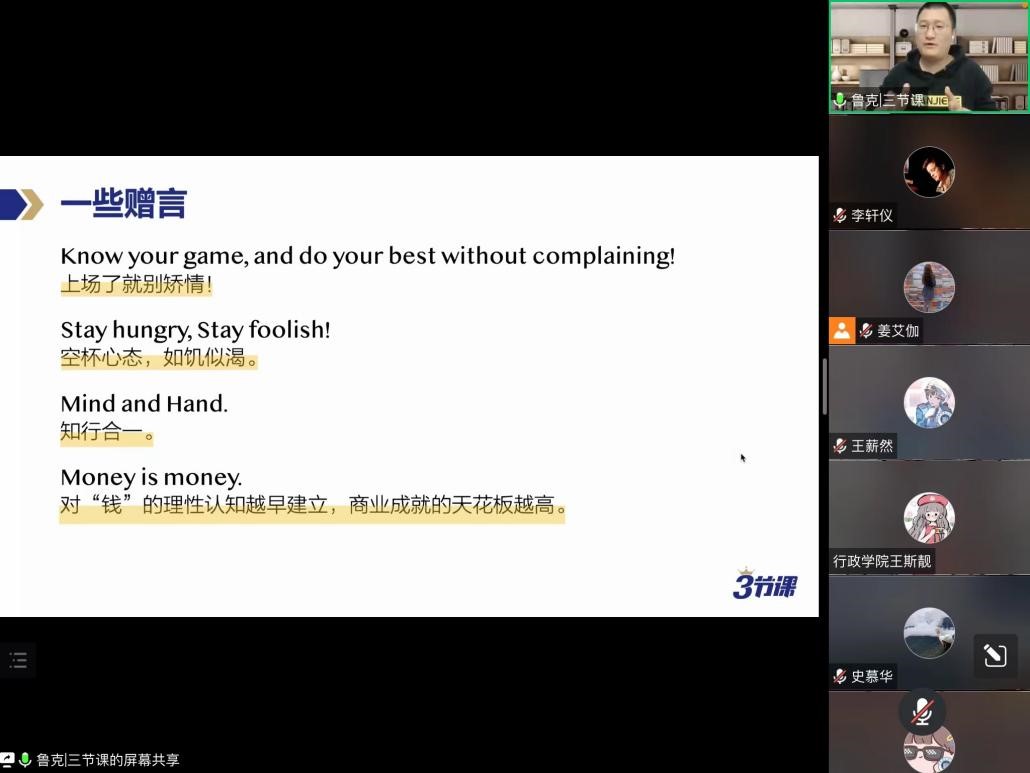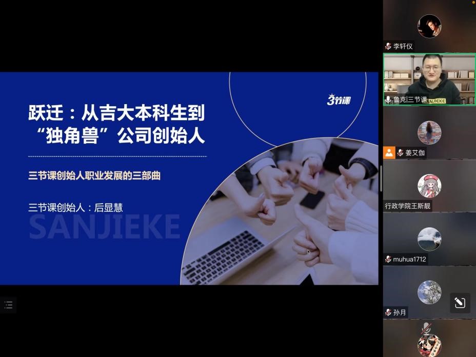 主办的“职业能力提升计划”系列活动在腾讯会议平台进行。此次活动邀请到三节课创始人兼CEO、中国传媒大学客座教授后显慧,做客腾讯会议室,为学生们作题为“跃迁:从成人抖音