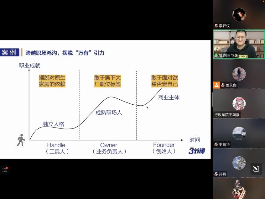 本科生涯到各大互联网公司产品经理岗位工作,从百度架构师到现在三节课创始人。重点分享了个人成长的规律,从拥有独立人格到成熟职场人再到商业主体。他强调,在就业的过程中既要摆脱对原生家庭的依赖,又要撕下大厂职位的标签,更要敢于面对挫折不断打磨自己。