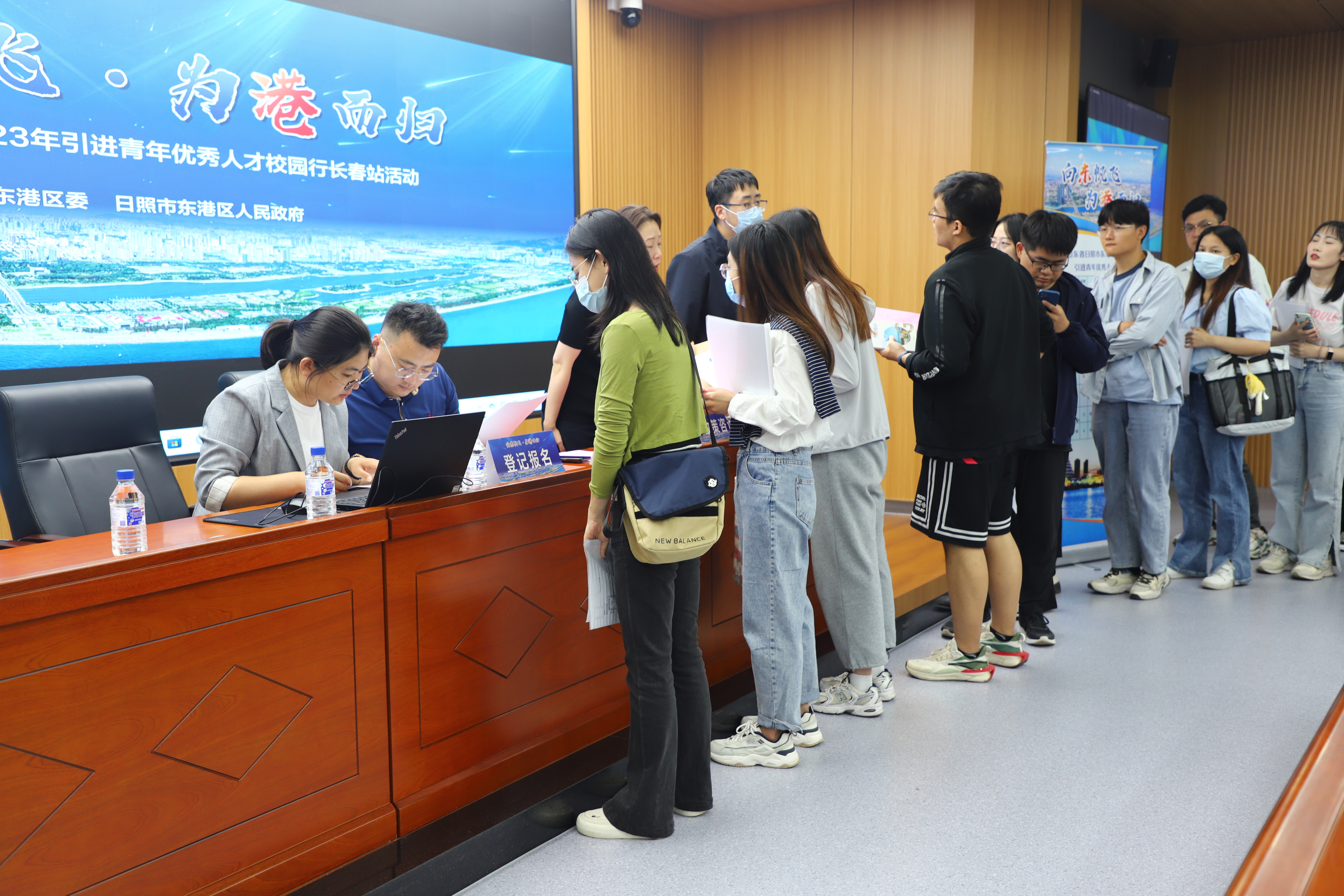 与会人员就东港区就业政策、青年人才引进、院地共建学生实习实践基地、委托开展公务员培训等方面进行了深入探讨。会谈结束后,东港区一行于东荣大厦B102报告厅开展了日照市东港区2023年引进青年优秀人才现场咨询会,50余名研究生同学到场咨询应聘。