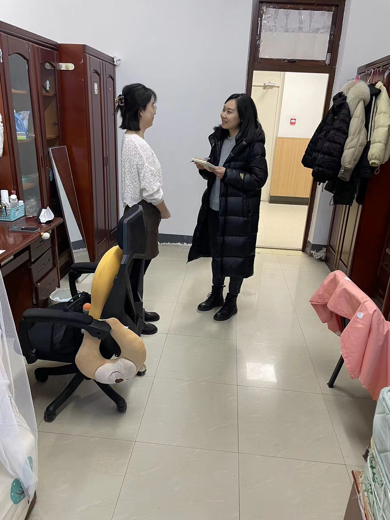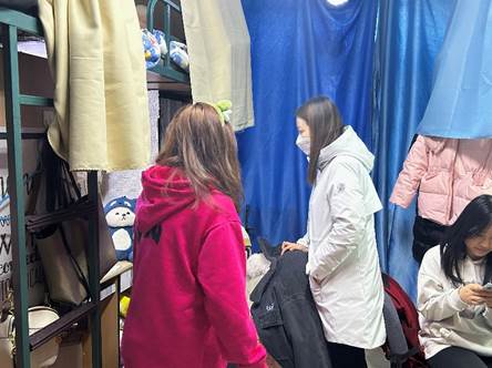 全部寝室。检查过程中,史慕华、张洁与学生们亲切交流,了解同学们返校后的生活状况,以及新学期的学习计划,勉励同学们在努力学习、拼搏向上的同时,注重劳逸结合,保持身心健康。辅导员们仔细检查了寝室的卫生及用电安全,特别关注了是否存在违章电器、私拉电线等安全隐患,并督促大家提升安全和卫生意识,要求同学们认真打扫卫生,及时清理垃圾,保持宿舍干净,注意通风消毒,小心预防春季传染病,共同创造安全、健康、有序的生活环境。