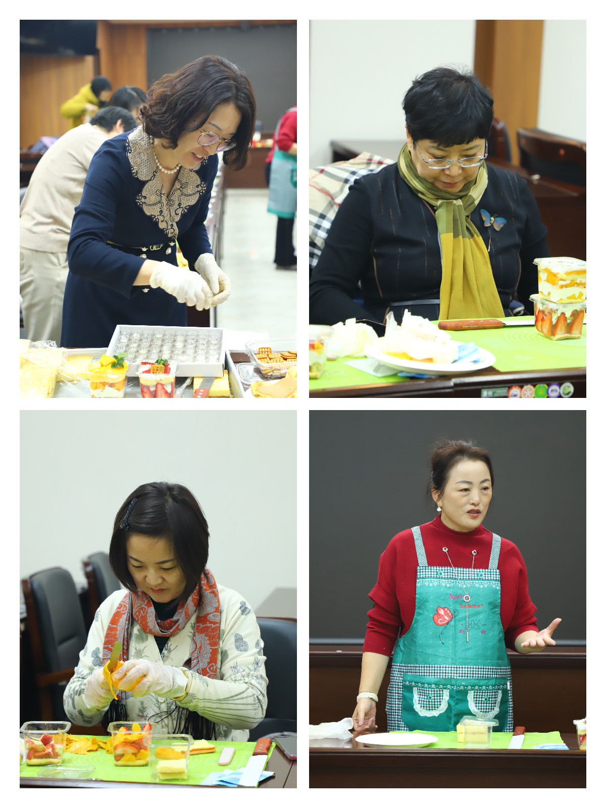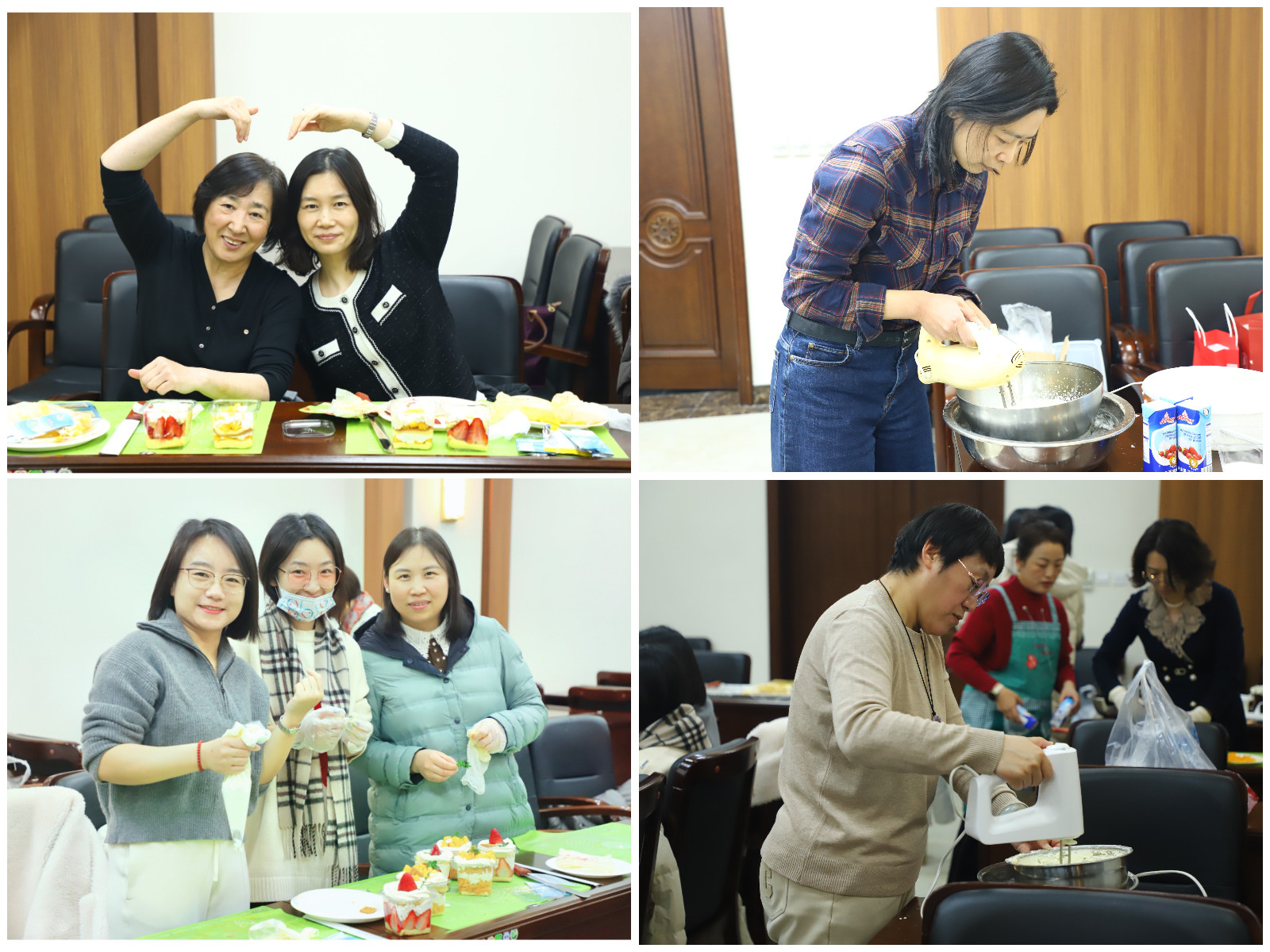 在王欣老师的指导下,老师们相互分工完成了蛋糕坯加工、装饰水果切块、动物奶油打发等步骤,并根据个人喜好制作了属于自己的独一无二的蛋糕。在充满奶香气息的活动现场,大家欢声笑语、气氛热烈,共同享受属于女性教职工的惬意时光。